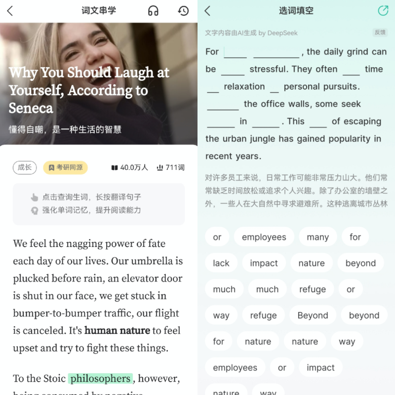 背完单词,还要会用在题里 很多背单词工具止步于"认识这个词",但考试要的是在句子、段落乃至完整语篇中运用。扇贝有两个行业首创的功能填补了这个空白。 词文串学:基于当天所学词汇、当前记忆水平和备考目标,AI智能匹配外刊同源短文,让单词在真实语境中得到二次强化。有用户反馈,切换到这个模式后,阅读时遇到刚背过的词会有明显的"熟悉感",而不是认词不认句。 短文填词:基于已学词汇,自动生成首字母填空、选词填空等高频考试题型,支持导出PDF用于集中刷题或打印复习。这意味着背单词和刷题可以同步推进,不再是两套互不相关的任务。对于高考、四六级或考研备考者,这个功能的实用价值是比较直接的。 此外,学习界面可切换为"试卷字体",还原真实考场卷面;平板用户支持同屏书写,随时拆词标注、不切换应用——这些细节是经过多年用户反馈积累下来的设计,而不是一次性的功能堆砌。