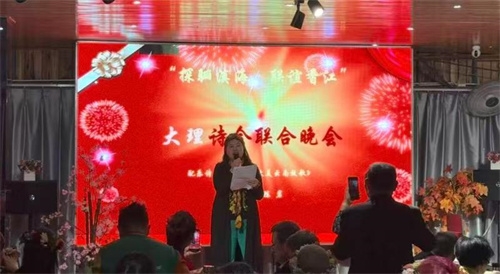 席间,诗人陈岩登台诵出自创篇章《我为大美云南放歌》,声情并茂间,把云岭大地的山川灵秀、人文深厚凝于笔端,情真意切,满场动容。(上图.大理诗会主持人之一:陈红)