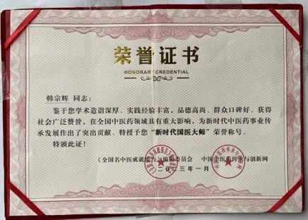 韩宗辉医生,一九七四年高中毕业后到一九八五年在石康镇中心小学教书,从一九八八年至一九九六年在家从事个体行业,还从一九九五年开始又一边学习和从事研究中医,专科研究和学习民间的传统医学和各种特色理疗方法。 二00四年起从事中医保健行业,经营南方医科大学(原第一军医大学)的中草药健康产品和广西大瑶山的中草药健康产品,几年来一直在南方医科大学(原第一军医大学)学习人体的中医保健和调理与经络理疗知识,又跟广西壮瑶两族的覃家华中医博士和北京汪杭玲专家以及广州蔡洪光经络专家学习中医调理和经络理疗。毕业于南方医科大学和国家教育部中史电教馆职业教育的《经络调理师》。 韩宗辉医生被国家授予:国医名师,国医功勋奖,医圣宝鼎医学贡献奖,“当代华佗”医师称号,中华特色优秀医师,优秀论文奖。中医康复治疗资深首席专家,中华医学国际发展联合会专家,中国中医科学院研究员,中华医学科技奖一等奖,当代百佳优秀名医,2015度科技人物奖,全国“传统中医百位名医’荣誉,中国科学家协会专家委员会第一届专家委员,中科清研终身客座教授.2017 年国家级科学家挂历荣誉,2012年至2017全国优秀科学家奖,中国科学家协会专家委员会第一批专家委员等。