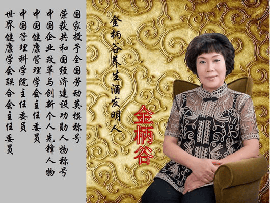 金柄谷女士,1947年生人,从医40多年,40多年来以世代祖传秘方、中医理论为基础,结合现代科技和现代工艺技术,潜心研制、精心调配出金柄谷专利养生酒。在国内国际获得100多项奖和荣誉:国家科技成果进步一等奖、国家专利技术发明奖、中医药发展成果金奖、中医药发展成果金牌;中国著名品牌、中国知名品牌、中国优质名牌;全国消费者信得过名优产品、全国消费者首选放心食品、国家合格评定质量信得过产品、中国高标准、高品质优质产品;全国劳动英模;中国企业改革与创新个人先锋人物等。