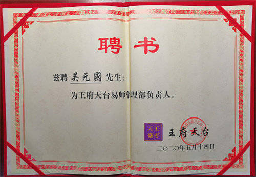 吴元国,字:承儒,号:长生无极,自幼跟随胡老先生研习易学,后结缘道家秘传名师传承,是国际易学文化研究会副会长兼潍坊分会会长、特聘周易策划师,华夏五千年环境科学研究院副院长,当代易学泰斗,山东瑶光易学院,企业管理顾问,北京王府天台全国易学实战应用大赛评委、权威易师、易师管理部特聘负责人……首席环境风水策划师,正所谓“五岳寻仙不辞远,一生好入名山游。”无极老师自幼研习易学,遍访名师,精研学术,巡游各地,至今事从易学策划与易学教育三十余年,常助人于绝渡逢舟之际,对结缘之人亦无不守望相助。“丹青不知老将至,富贵于我如浮云。”时至今日,无极老师亦潜心于易学研究,醉心于助人达济,澹泊明志,宁静致远。 瑶光易学,给你想要的未来!