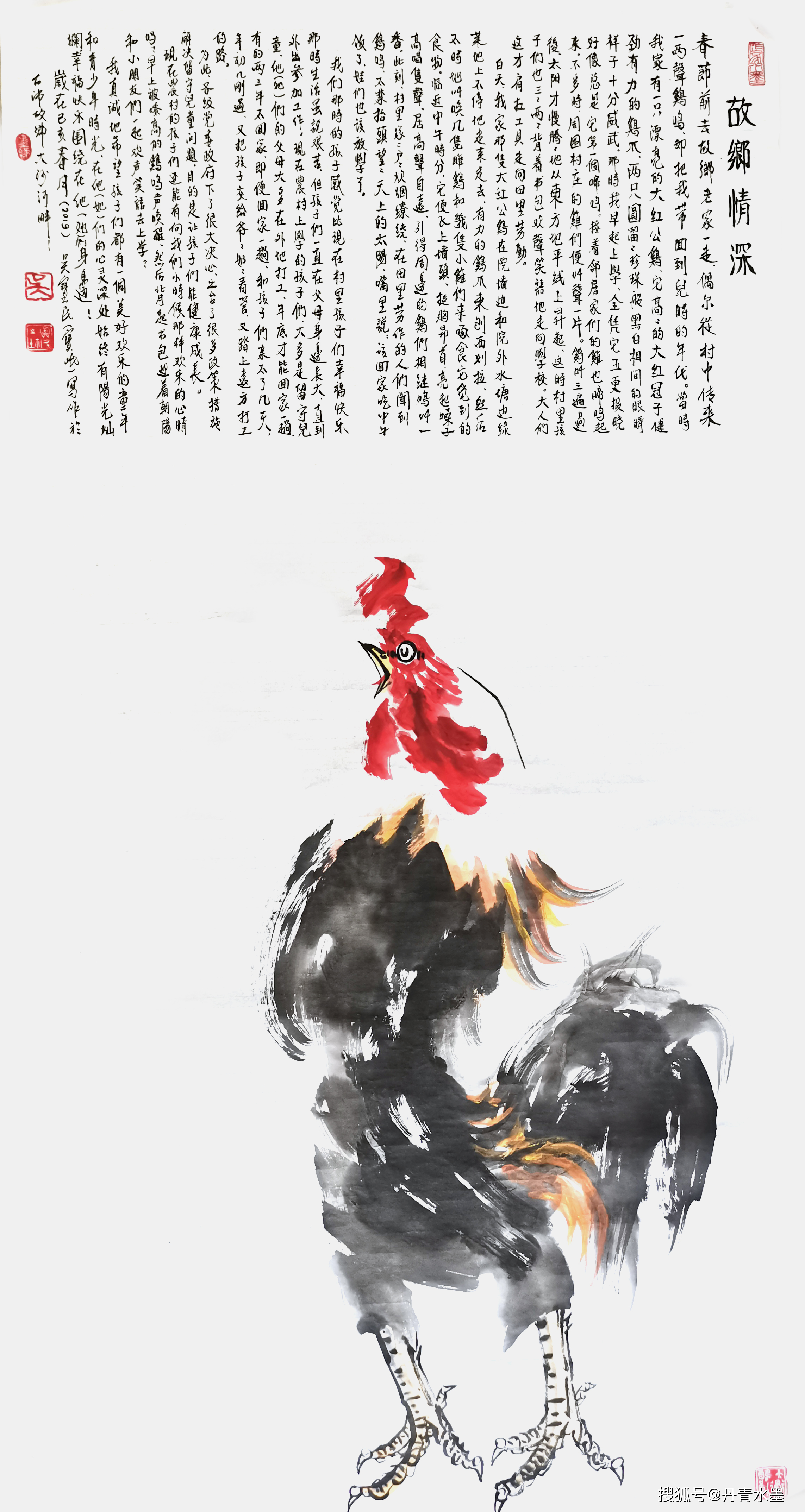 吴宝民先生是“中国作家协会会员”,这是我多年前知道的,而“中国书法家协会会员”,却是近年的事。他不仅作书、写字、画画,而且均成为“家”。他成功后面的辛苦,可想而知。近些年,我给他写过几篇文学及书画方面的评论。他的绘画,在我看来,值得称道的是其意境,其方式,其思维。我曾写过一篇叫做《神话、现实与想象的一体化实践》的文章,是就吴宝民先生的“喻象派”水墨画“龙凤荷”系列所作的评论和探讨。在这篇文章中,我首次提出“喻象派”的概念(喻象一词出自南朝文学家刘孝标注引《支遁传》)。我认为,中国画正处在“多元创新时代”,吴宝民先生是创新中的一员,他的探索十分有益,他以奇异思维见长(我俩曾深谈过一次)。我称之为“喻象派”,他这个集子里选用了不多几幅。吴先生有意识这样试验,首创,用自己的努力开创了这条新路。他的“龙凤荷”系列作品,是以中国古代图腾“龙”“凤”以及现实生活中的“荷”作为想象的基础,从“中国梦”的角度切入,融神话、现实与未来想象为一体,创作出的属于他“一个人的世界”。 吴宝民先生这次收入该集子里书画,还分别有书法、花鸟、人物、山水等。他的字如其人,柔中含刚,收放自如,个性见长,不失传统。他花鸟画中的鸡,尤其雄鸡,虽属中国传统独立画科,但他的画法实不多见,造型夸张,线条奔放有力,形神兼备,个性鲜明,墨韵不落俗套,独具魅力。观其鸡图,鸡爪健劲,鸡喙坚定,昂胸鸣啼,雄强豪放,目光如炬,冠如火焰;又如旗帜,很能换起希望,不愧其光明的使者;且寓大吉大利,吉祥美满,托物寄情,其“五德君子”之风跃然纸上,体现出了中国人特有的民族精神和文化艺术形式。他画的鸭,栩栩如生,连功带写,毛翎清新,顾盼传神:池塘清水涟涟,荷花妍妍,荷叶如盖,墨韵十足,三两只鸭浮动在荷花莲叶之间,偶尔“呷呷”几声,悠哉游哉。更可贵的还是他以物寄情:“不见故乡旧人面,只闻荷间鸭鸣池”,是他对故乡的眷恋,对乡亲友人的念想,是浓浓的乡愁。《故乡情怀》系列,《鸭唱荷花池》系列,连篇累牍,数百幅勾勒涂抹,无不情景交融,这是吴宝民先生对家乡的一草一木,一石一水地热爱。他的山水画,包括他的田园山水,诗中有画,画中有诗,诗书画融为一体,同样表达他对家乡对祖国的大好河山爱之深、情之切。2017年和2018两年来,他的《五德君子图》《龙凤荷》《鸭唱荷花池》《共享家园》等8幅作品,先后被中央电视台书画频道、人民日报海外版、中国多民族作家协会、中国作家书画院等组织单位选展并收藏。