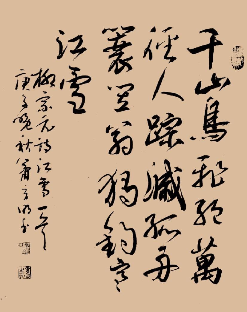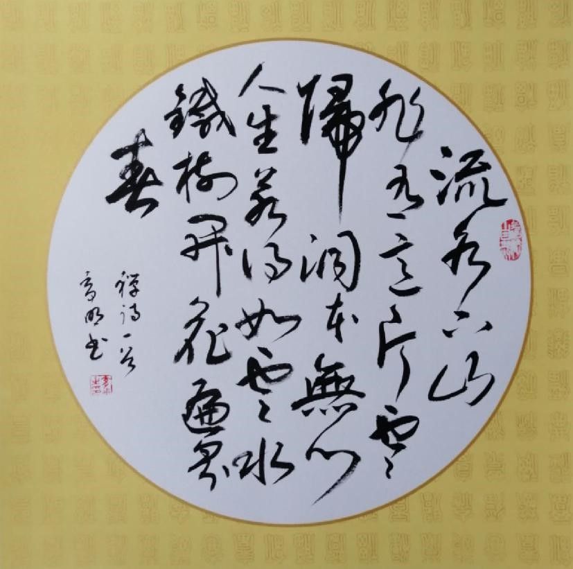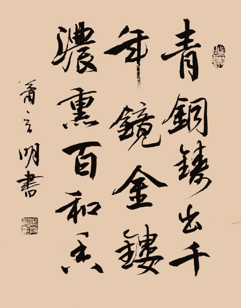 禅诗一首(释文 流水下山非有意,片云归洞本无心 人生若得如云水 铁树开花遍界春) 2019年 50×50㎝ 萧先生练书法既有过人的书性,还有执着的耐性,不成功都不可能。他出身书香世家,自幼随父习书,觉悟早开,经过数十年刻苦临法帖,并先后得到多位湘籍书画名家指导,可谓是法由师授,功由户出。这就是书法进取过程中生而知之愤发,学而悟之忘餐的典范!观看他的书法,可以了然而论:书法功夫是练出来的,法不欺世,功不欺人的翰墨实力等不来、靠不来,唯有扎扎实实磨砺碑帖,才可以像萧先生这样作书法有妙中增妙,新中更新的优质成果。 书法是一门实践性很强的艺术门类。说到底你得经常“用”,书法才能写得好。萧先生的职业不是书法家,曾长期在新闻宣传部门工作,这个职业就有“常用”书法的必然,也是必需!基于用成于需,他让书法回归实用要义,所以作书法起笔落笔就相当自然,写出金书锦字也就是必然。回头看看历代书法大家,没有一人是“专业搞书法创作”的吧,都是文化人在“用书法”的过程中,渐渐积累成善书的功名,然后成为百代师法的贤圣!