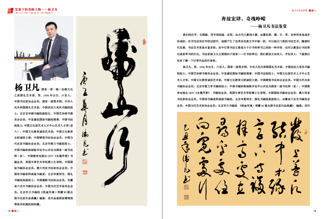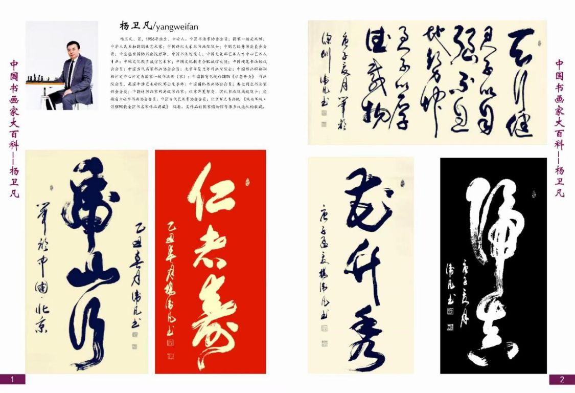 杨卫凡、男,1956年出生、六安人。中国书法家协会会员;国家一-级美术师;国礼艺术家;中国世纪大采风书画院院士;中国艺协榜书委员会会员;中宣盛世国际书画院理事,中国书法院院士;中国文化部艺术人才中心艺术人才库;中国文化教育诚信艺术家;中国文化教育合肥诚信大使;中国硬笔书法协议会会员;中国当代名家书画协会会员;北京华夏兰亭书画院院士;中国书画职称润格评定中心评定为国家一-级书法师(家) ;中国教育电视台CETV《水墨丹青》书画院会员,英国牛津艺术学院博士生导师;中国国际书画协会会员;澳大利亚书法家协会会员;中国诗书画家网高级书画家;北京华夏邦交、国礼书画院高级院士;安徽省六安市书画协会会员;中国当代艺术家.协会会员;北京军天书画院《铁血军魂.荣耀90载全国书名家作品典藏》编委。其作品被国家博物馆等很多权威机构收藏。