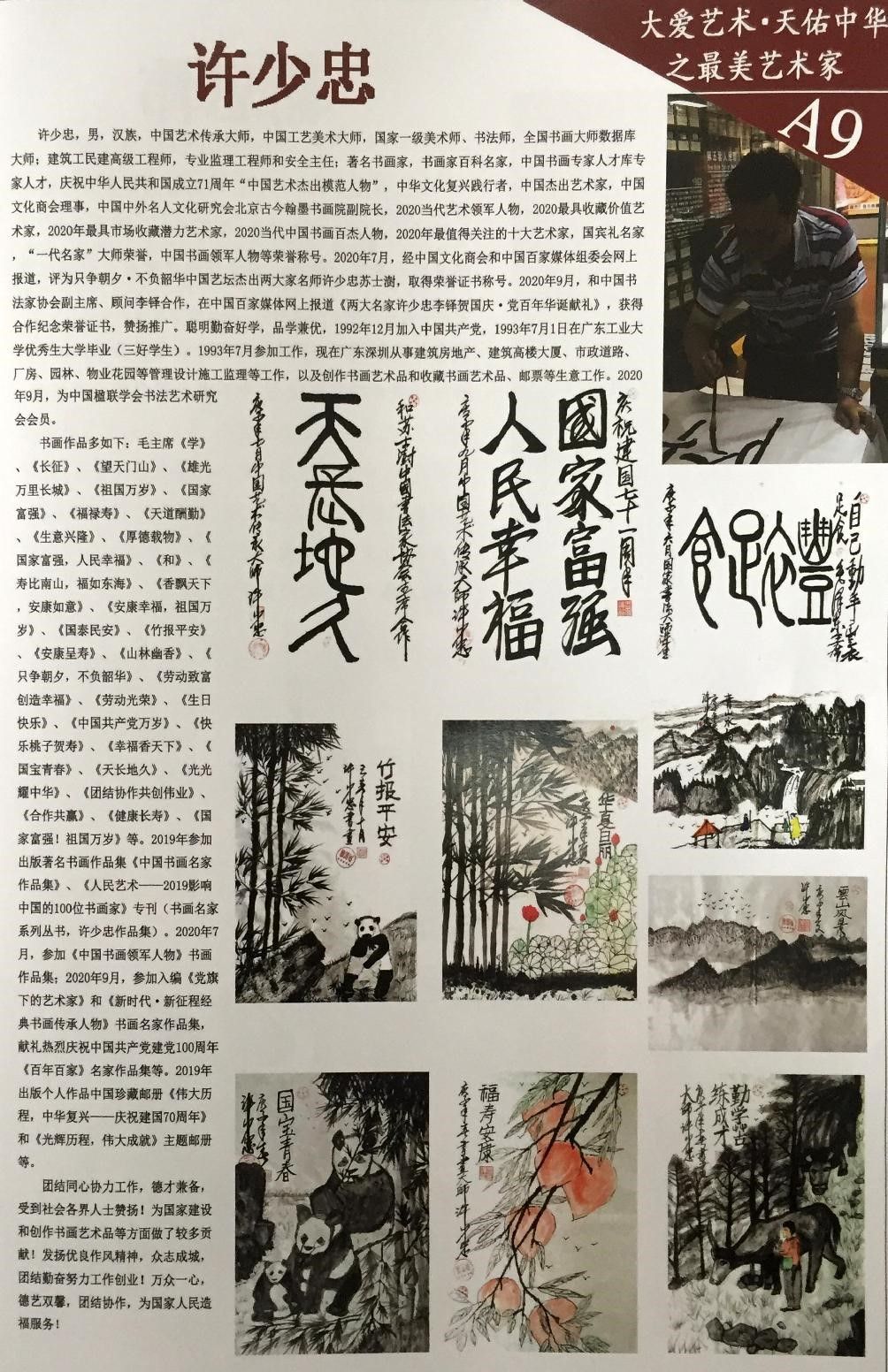 2019年参加出版著名书画作品集《中国书画名家作品集》、《人民艺术——2019影响中国的100位书画家》专刊(书画名家系列丛书,许少忠作品集)。2020年7月,参加入编出版《中国书画领军人物》书画作品集;2020年9月,参加入编出版《党旗下的艺术家》和《新时代·新征程经典书画传承人物》书画名家作品集,以及献礼热烈庆祝中国共产党建党100周年《百年百家》名家作品集等;2020年10月,参加入编《辉煌广东》书(广东优秀企业与杰出人物纪实,中国经济出版社)等;2020年11月,参加入编出版《党旗下的功勋人物》书和电子版画册等。2020年10月,参加中国工业合作协会举办《大爱艺术·天佑中华》报刊书画作品报道,评为大爱艺术·天佑中华之最美艺术家、书画艺术名家大师荣誉称号,荣获证书等。2019年参加出版个人书画作品中国珍藏邮册《伟大历程,中华复兴——庆祝建国70周年》和《光辉历程,伟大成就》主题邮册等。2020年书画作品参加入编“文化复兴、砥砺前行——中华文化复兴践行者走进迪拜”珍藏邮册制作、出版;参加入编庆祝建党100周年艺术名家《永远跟党走,共筑中国梦》中国珍藏邮册制作。2020年10月参加入编中国文化进万家日历(年鉴)编辑委员会举办出版2021年日历活动。2020年11月,按照教育部、中国文化商会等有关部门要求,经过教育部专家人员评选,书画作品入选出版《中国书画教材》等。 团结同心协力工作,德才兼备,受到社会各界人士赞扬!为国家建设和创作书画艺术品等方面做了较多贡献!发扬优良作风精神,众志成城,团结勤奋努力工作创业!万众一心,德艺双馨,团结协作,为国家人民造福服务!