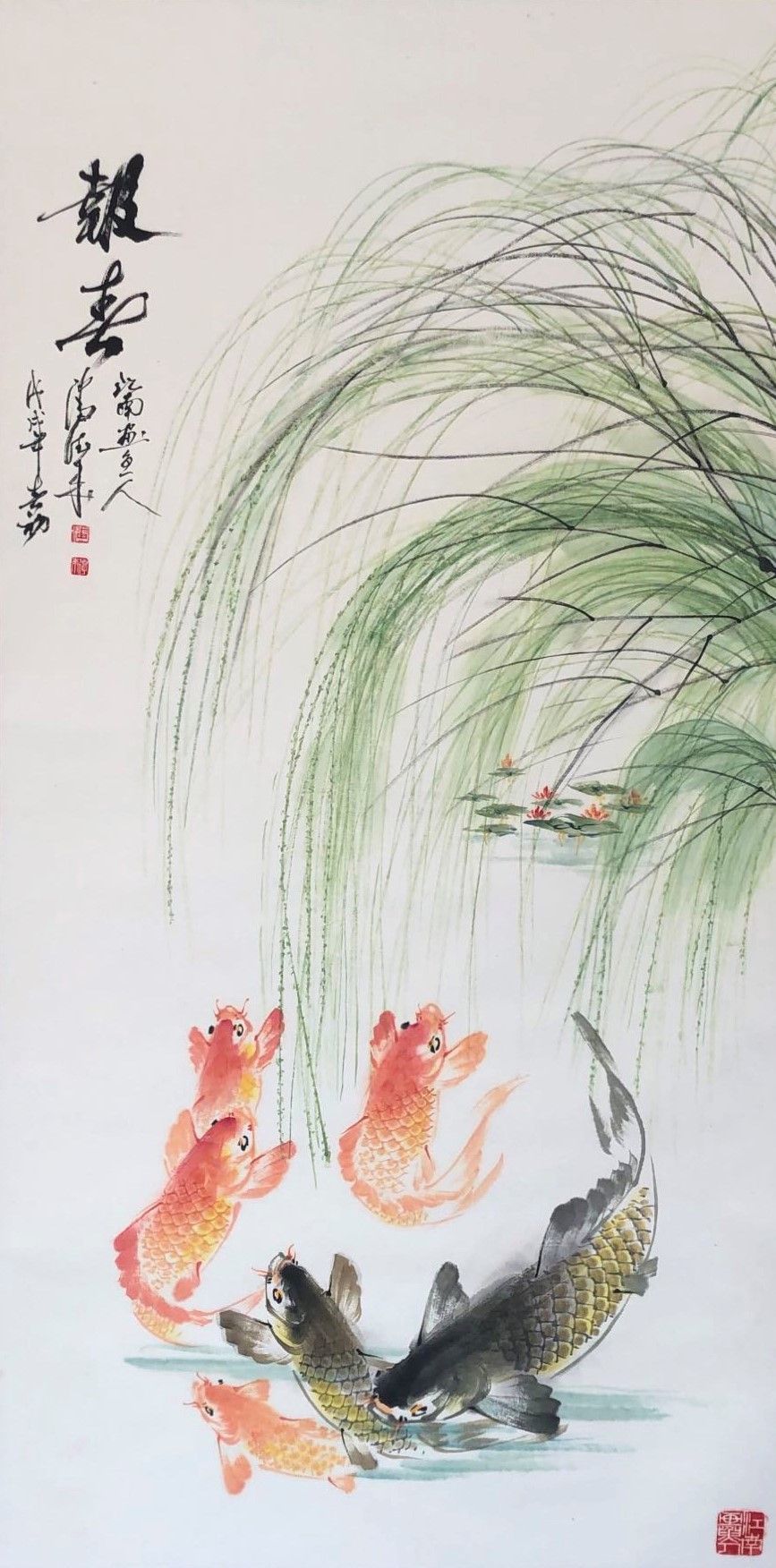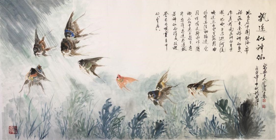 齐白石画虾可是一绝,徐悲鸿画马已成标志。凡是大家,必有独技。花鸟大家潘德来画锦鱼,可功比白石,技成悲鸿,同样打造成了独家所有,无人可攀的艺术标签。同齐白石画虾成趣一样,潘德来画鱼也经历了观察提炼,再观察再提炼的艺术过程,盆中之鱼被提升为海中之龙,风中之凤,鱼成龙凤,飞腾俊达,姿形相当悦目,精神非常高远。观赏他的五彩锦鱼美绘,见排浪迎空,气势大出,如长虹一般,通贯日月。锦鱼跃而成飞,思绪与理想寄托其中,跃跃然惊天动地,辉辉然奇美大赏。锦鱼在潘德来的笔墨里,师于自然,成于精神,以意境为功,以理想为成,锦鱼并非池中物,德来绝是寓意深。锦鱼既可以悬而细赏当悦目,又可以合以收藏成珍重。锦鱼图以潘德来为尚品独家,已是功成印证。