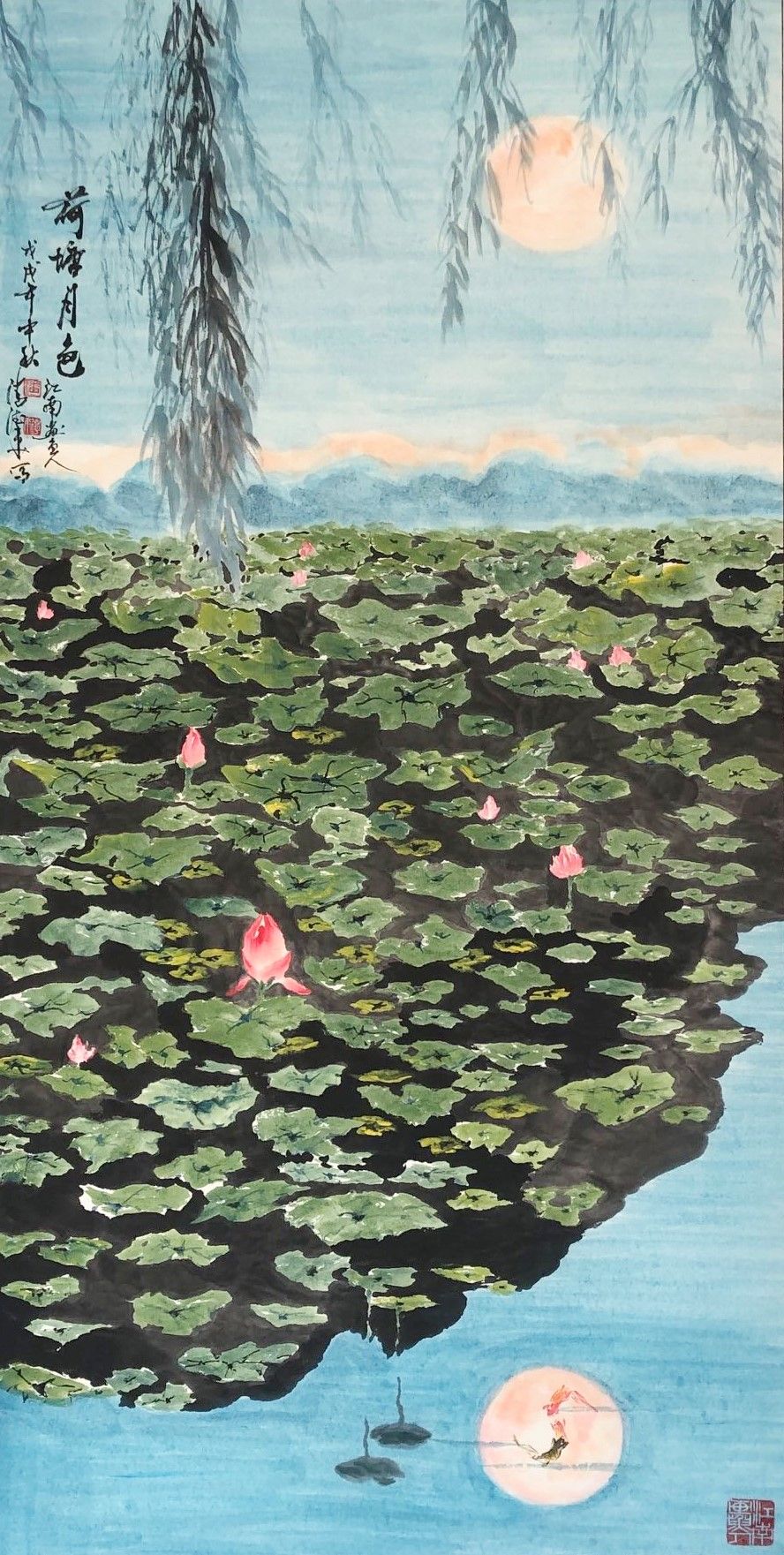 潘德来作品赏析 一带一路成为国家强盛的新兴大计,潘德来难掩激动情怀,依习近平访问法国时所谈中国是一头醒来的狮子的哲思为主旨,精心创作《醒来》一幅作品,以寓意化的构图方式,绘成荷花为美,红绛为神,霞托日出,云染五彩,醒来之意,被巧妙地寓意在自然的动态之中,取意境,成美韵,不施教化,无声胜有声,丹青尽是中国风。醒来之意,丝丝缕缕,生于天地,缭绕心田,墨色的氲氤有厚有逸,笔画筋骨有显有没,虚为写意,实为工笔,既有齐白石似与不似之间的精妙,又有工笔重彩的庄严肃穆,还引入了油画的光影与透视,可谓中西结合,可达南北,对一带一路精神的表达切意实成,是同类题材中的精工作品,被多家出版刊印,作品功能已经超越了画质本身,进而成为国家理想的代言宣誓。主旨之功,依此可见。他的画笔总是这样关注国计国事,主旨高端,自是必然。