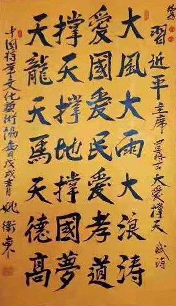 诸书皆成笔墨浓情,意气风发艺海畅游。姚卫东是一位有情怀,有视界,有胸襟的书法艺术家。书法线条在他的转捻下,华态朴茂,意气风发,是艺术也是情感,更是传颂文化的大手笔。所以他的书法创作,不是文人戏墨的小境界,而是理想挥洒的大功成。书有主旨,歌以盛世,让他的书法不但拥有艺术的高端品质,也成为与时代精神合流而趋的大道旗帜,引领时代,光彩夺目。 ——著名书画评论家 史峰