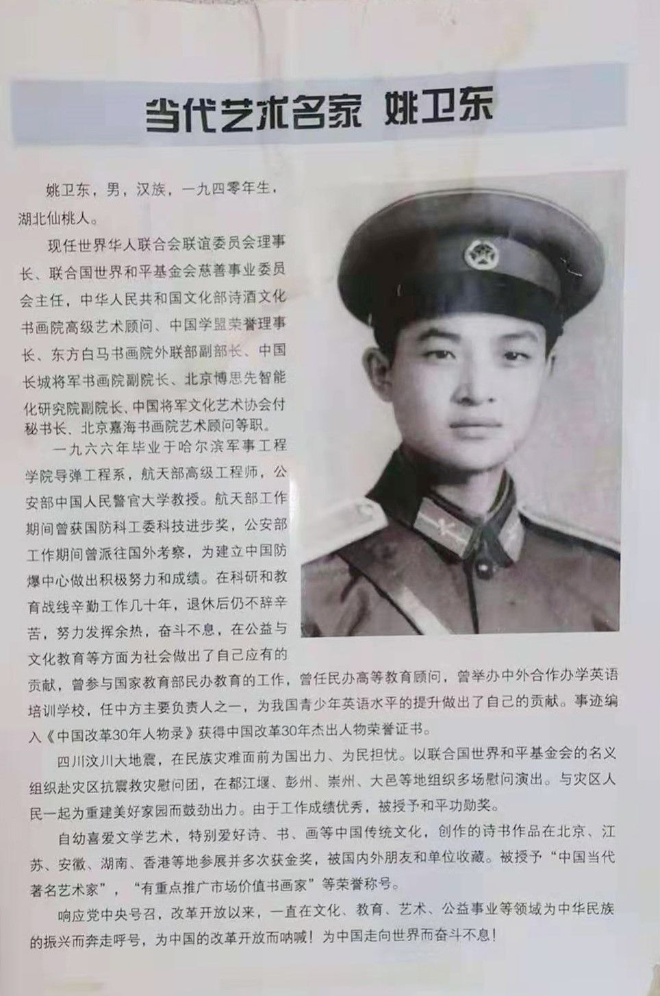 姚卫东,男,汉族,1940年生,湖北仙桃人,国家一级书法师。自幼酷爱文学艺术、诗、书、画等中国传统文化,创作的诗书作品在北京、江苏、安徽、湖南等地参展并多次获金奖,被众多国内外朋友和单位收藏。现任世界华人联合会联谊委员会理事长、联合国世界和平基金会慈善事业委员会主任、中国学盟荣誉理事长、东方白马书画院外联部副部长等职。1966年毕业于哈尔滨军事工程学院导弹工程系,航天部高级工程师。在科研和教育战线辛勤工作几十年,退休后仍不辞劳苦,努力发挥余热,奋斗不息,在公益与文化教育等方面为社会做出了自己应有的贡献。曾参与国家教育部民办教育的工作,曾任民办高等教育顾问,为我国青少年英语水平的提升做出了自己的贡献。四川汶川大地震,在民族灾难面前为国出力、为民担忧。