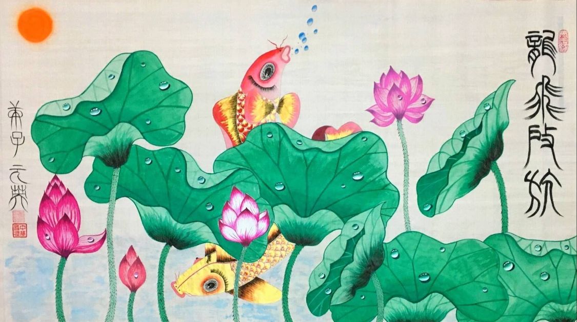 董元英女士笔下的鱼、荷,以工笔的手法将鱼的情感变化富于到点线和色彩的变化中,以意赋形,情境交融,又不失灵动,画法细腻工整、意境婉约恬静、色调亮丽清新、动态顾盼生情。画面强调整体结构的规则,线条布局和色彩喜用强化的手法,重视文化意蕴的表现,精神思想的传达和生活趣味的展示。董元英女士在画面布局、色彩渲染、形态酝酿等层面创造了一种写意与工笔的笔墨构成方式。其作品洋溢着浓烈的诗意;意境幽美,又构思精妙,意绪潇洒。其注重意趣和意境的表现性,达到了传统与现代、形式与内容的完美统一。