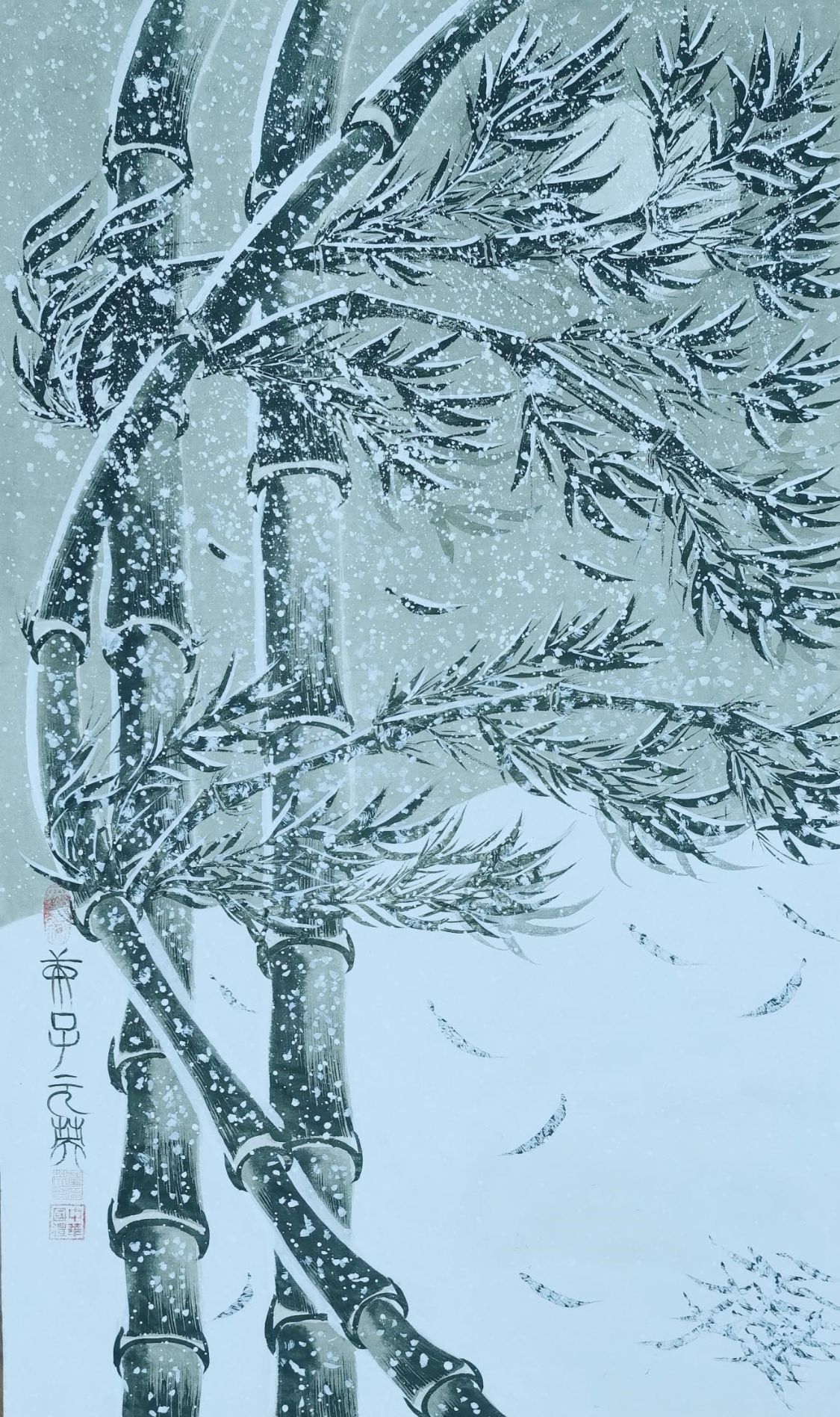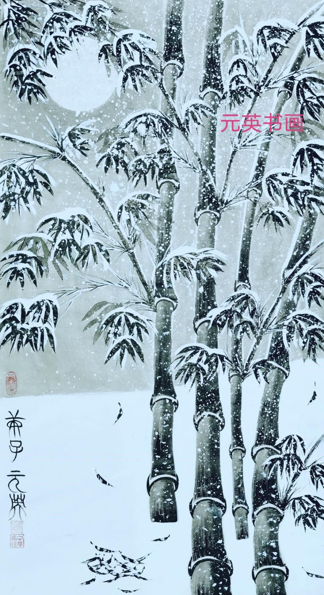 二、艺术风格 画竹即画人,“竹”是董元英女士心灵的迸发。中国人素来喜竹,喜欢它挺拔、飘逸的身姿,恬淡、高雅的情怀。董元英女士笔下的“竹”用其独特的绘画语言表现出竹子的清雅、刚正、苍劲、古朴、坚毅的形态。以激情的状态,情感的表露,关切自然,呈现出被生命意识包涵与容纳的主体景观,并以内在情境的延伸与拓展,表现出一个肃重内敛、宁静淡泊的精神世界。董元英女士在画面构图上布局饱满,色彩相宜,立体感强,乘古而不泥古,构思精妙,典雅朴真中透出高贵之美。她将竹的自然灵性与内心世界所要表达的情感交汇出理想的色调,使画面既充实又不失空灵,既得传统笔墨之精华,又创现代笔墨之新意,通过这些情感特质提炼出高雅而深远的意境,让人们看到的是充满温情的平和景象。欣赏董元英女士的竹子,让人仿佛置身竹林,映入眼帘的是一片青翠的绿色,一株株翠竹高耸挺拔,顶天立地,让观者的心灵获得美好、祥和的心境。对于整体布局的把控和细节的描摹,她遵循了自然与写意相互统一,意在营造一种充满清气、古意的情调和气氛。以技入道,所以她的作品清雅秀丽、境界深远,透露出她独具特色的审美情趣。