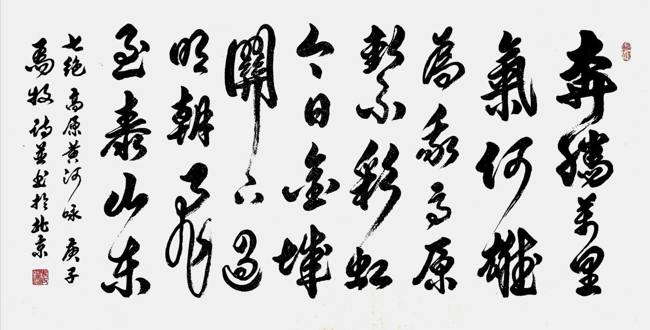 马牧诗并书七绝《高原黄河咏》 奔腾万里气何雄,为我高原系彩虹。 今日金城关下过,明朝飞至泰山东! (辑入《五四以来名家诗词选》)