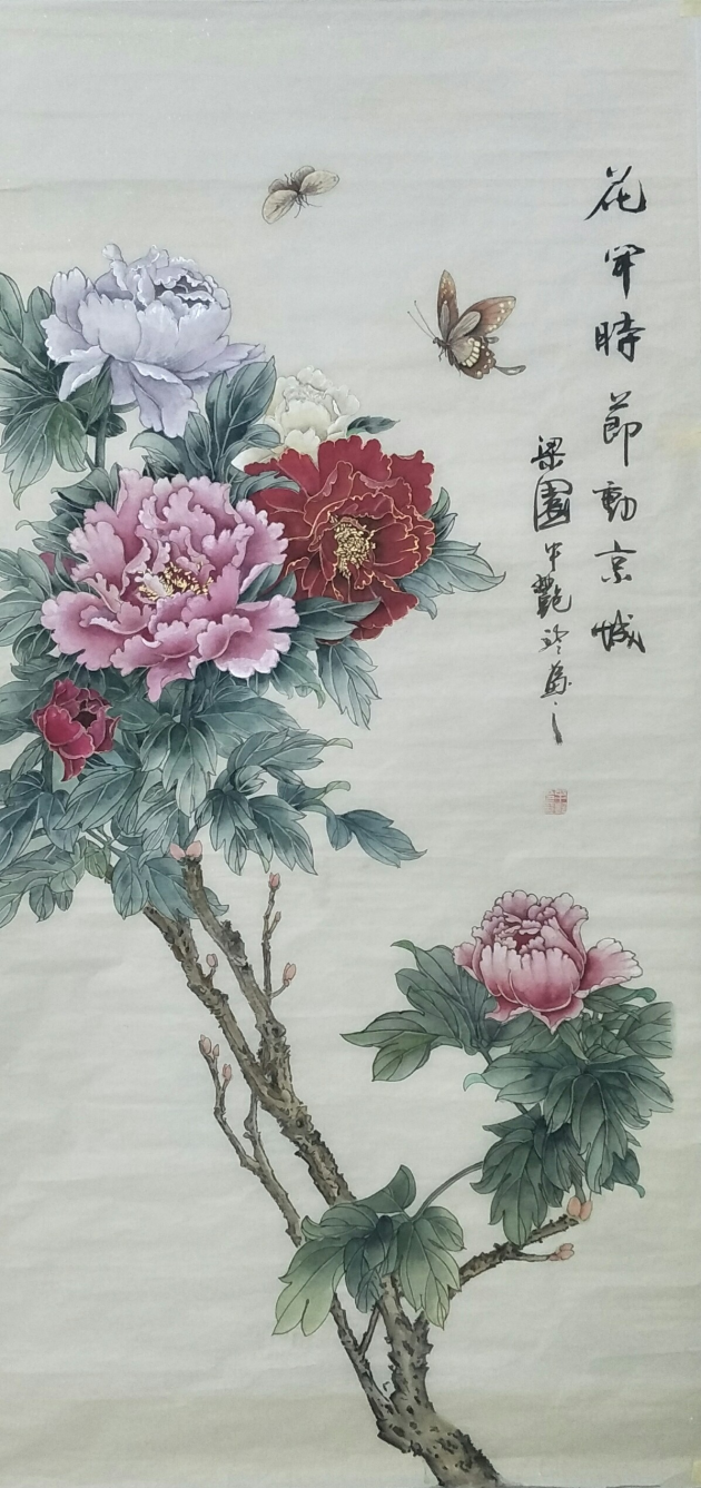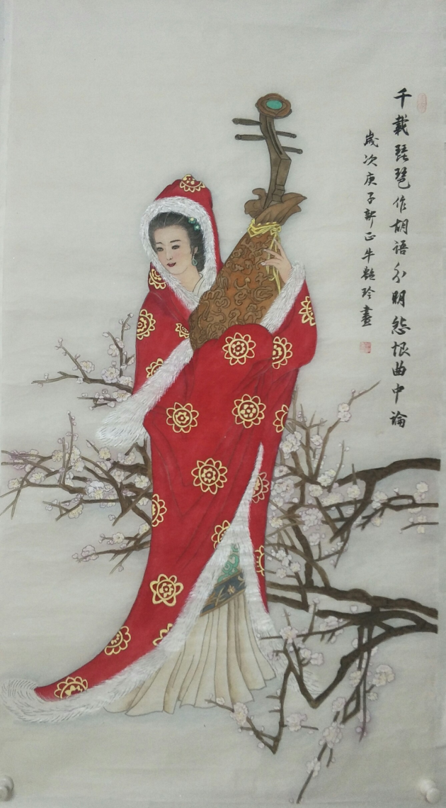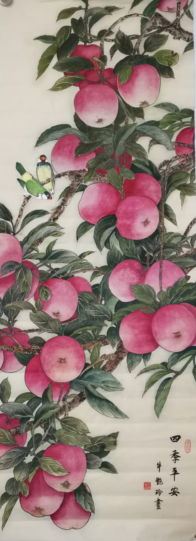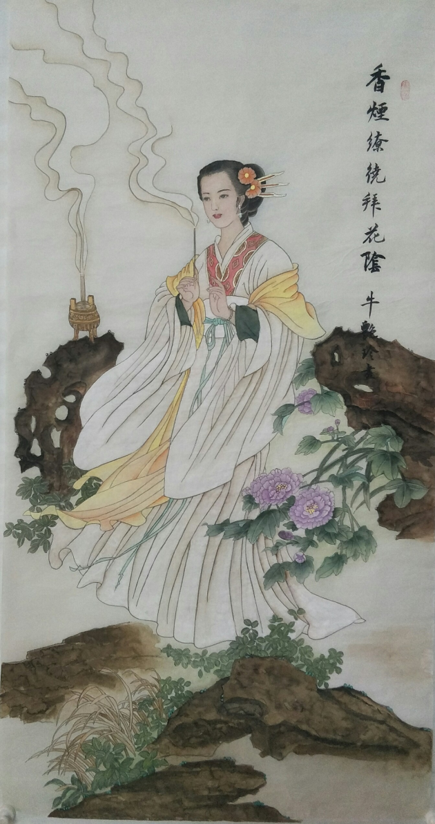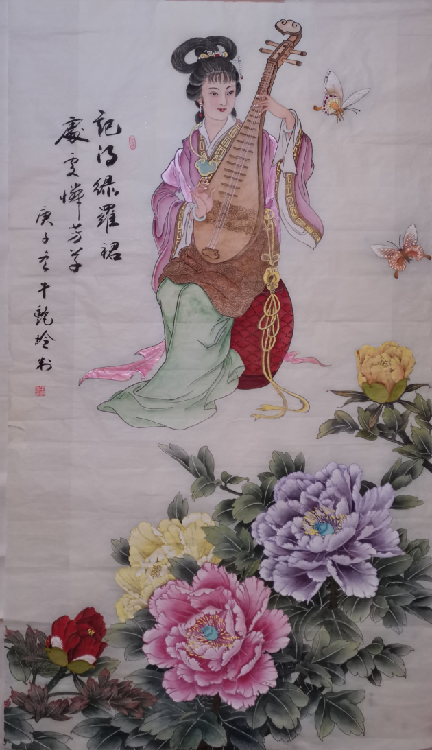 2017年10月作品《工笔人物》参加“庆祝河南大学建校105周年校友书画展”并被河南大学收藏; 2019年6月,工笔画作品《花开时节动京城》入选“丝绸之路”港澳书画作品交流展,并被授予优秀书画家荣誉称号(香港国际书画院、甘肃省收藏协会); 2020年3月,工笔画作品《国色天香》入展第六届中国廉政文化书画展并获精品奖(最高奖项)(中央党校、中国法学会、中国文联、中国美协、中国书协等作指导单位,中国行为法学会廉政研究委员会、中共北京市丰台区纪委等主办)。 中国工笔画历史悠久,源远流长,起源于战国,盛行于唐代,成熟于五代、两宋,创新发展于明代。明末清初,由于西洋画传入中国,中西合璧,相互借鉴,从而使工笔画凸显出造型的准确性、线条的自然性及内容的诗意性。牛艳玲善于继承中国悠久的文化艺术传统,精通中国画、油画、素描,其中尤擅长工笔人物,兼工笔花鸟、山水以及书法、篆刻,可谓“全材”。 牛艳玲自幼受其当老师的父亲牛惠卿熏陶酷爱书画,早在1991年她在开封市电缆厂当工人时,其工笔画作品《宝莲灯》就被开封市文联评为最佳优秀奖,彰显了她扎实的绘画功底。五十多年来,无论是在工厂务工,或是下岗失业、生活困顿,或是在社区当主任,服务基层群众,忙于繁杂工作琐事,都没有阻止她对书画艺术的孜孜追求和潜心探索。她先后拜师于河南省美术家协会副主席、河南大学艺术学院教授、著名画家袁汝波,河南大学艺术学院教授、著名画家薛声韵并成为薛教授的关门弟子。同时,牛艳玲坚持向历代著名画家学习,每天临摹历代画作不少于六个小时,一年四季无论寒冬酷暑,或是生活工作再忙也雷打不动。临摹早已成为她的必修课,画画创作亦成为其生命中极其重要的组成部分。在工笔人物方面以临摹唐代阎立本、明代仇英居多,在工笔花鸟画方面以临摹五代黄荃、徐熙居多,工笔山水以临摹宋代李成、明代唐寅居多。牛艳玲摹古而不拘泥于古,逐渐形成了自己的工笔画画风:形神兼备、清新脱俗。牛艳玲在其工笔人物作品《寿星图》创作上画法工致细腻,衣饰高贵典雅,更表现出了老寿星慈眉善目、笑容可掬的神态气质,又如艳玲在其工笔花鸟画《听秋》创作上表现出了鸟儿活跃之态,栩栩如生,且翎毛工细逼真、呼之欲出,又对秋荷形态色调表达精致准确、清新脱俗;再如艳玲工笔牡丹作品《花开时节动京城》对牡丹花的叶、瓣、蕊画出了光色艳发、妙穷毫厘的富贵、形态与神韵,同时通过细观游戏的蝴蝶,可以确定所画的是中午前后这时间段的牡丹。