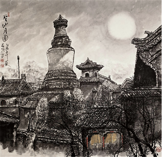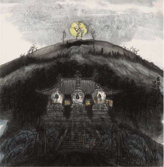 可以说,韩东光是在回归传统,以“水墨为上“,实现了“笔中有墨”与“墨中有笔”的结合。更重要的是,这种回归正是韩东光走向现代的一个路径,至少在以下几个方面,他的追求明显不同于传统,他的“水墨乡情山水”自成了有别于古人的家法。 其一,他热爱家乡的那片土地,表现的是充满生气的山乡。作品所蕴藏的意味、境界都是自己真切的现实生活感受,那是父老乡亲的栖息之地,远远超出了古人隐逸避世的思想范畴。从他的作品看去,无论是画佛境晨曦,还是画故乡月夜,抑或是晋北的沟壑疏林,他总会极力提炼与现代人精神相吻合的元素,然后再将其组合成一种纯情感图式的山情水境。透过他的一幅幅画作,人们自会体验到切中现代人的情感和想象的部分,从而获得了独特的审美效应。