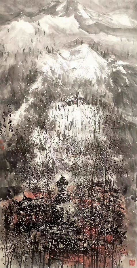 细加推究,韩东光的绘画首重一意字,终成一境字,画山乡题材虽单一,立意则幅幅有变。如《塬上春》之万象更新,《高原盛夏》之郁郁葱葱,《朝霞》之满天祥瑞,《静夜》之明月高悬,《佛境》之佛光常驻,《秋韵》之万山红遍,《冬晨》之茫茫雪韵,等等,图式结构、章法布局、丘壑安排、形式构成、色彩处理、笔墨表现,皆因立意而变,强化感受,深化意趣,浓缩成一种中国化的田园之思。正因为他的山水画皆从生活中来,从真实的山水中来,但又不照搬自然,是意与境、情与理、神与形的交汇体,所以他的作品虽千变万化,幅幅不同,但无一不别出心裁地表达了人们共同向往的境界和自己的独特感受,所以我将韩东光的山水画定位于从传统走向现代的“彩墨乡情山水”。