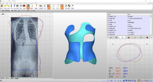2、计算机软件设计支具形状 在精准的人体数据上,完美匹配X光片,直接设计侧弯支具的矫正方案,准确把握脊柱侧弯矫正所必需的矫正位置和最佳矫正力度,避免了手工修模中因石膏膨胀系数对模型精准度上产生的误差。使用CAD/CAM技术,有效缩短制作时间,大幅提升制作品质。