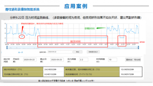 4、智能监控系统助力脊柱侧弯支具 智能监测系统包含档案信息管理、体表扫描数据、X光片存储等功能。就是在传统支具的基础上,增加了压力传感器、数据收集器、手机APP客户端和数据集合的云平台。 通过单片机嵌入式软件对压力信号处理后,转化成曲线,传输到云端,嵌入式传感器中施力区安装柔性压力传感器,终端的手机APP显示压力和对应时间的变化曲线以及有效佩戴时间,云端服务器采集每天压力随时间变化的数据。