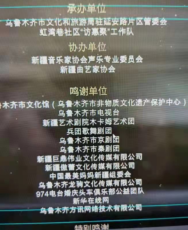 著名军旅笑星、新疆曲艺家协会主席高建新、新疆方言艺术终身成就奖获得者荣卫表演的相声《我们的社区亚克西》,讲述了社区工作者在抗击疫情、文明城市复检,人口普查中付出的艰辛与努力,诙谐幽默的语言将现场的气氛推向了高潮。 女声独唱《天耀中华》,合唱《最美的还是我们新疆》配乐诗朗诵《乌鲁木齐 我的故乡你的家》表现了中国深沉的家国情怀,体现出各族人民对祖国、对家乡真挚热爱。 编辑