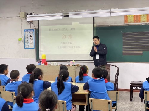 图3:鲁鸿辉榫卯体验课堂 另一个602教室由丈亭三江小学剪纸老师赵央春主讲。第二节课,两教室课程互调。8:30到10:30潮传非遗——榫卯体验课堂。由余姚金桥红木的陈雄斌和鲁鸿辉在602和603两教室轮讲。本次体验课堂难能可贵的是,他们直接带来金桥红木的榫卯结构连接道具、大红酸枝红木筷子和小叶紫檀红木椅子,学生们通过闻、抚、摸、看等能感同身受学到红木知识。知识点有什么是榫卯?就是两木构部件连接时用凹和凸的方法对接,并且可按顺序拆卸,难能可贵地是装好后您根本看不出这种结构,不影响物件的美观。他主要被用在古代木构建筑和旧时家具制作中,余姚河姆渡七千年前就用该技术做干栏式房子。最后,主讲者还把积木和榫卯结构进行了对比,告诉学生积木和榫卯相类似。从拆装鲁班锁的三根、六根到九根的挑战,认识古人榫卯结构的精妙智慧。在拆装中有演示、有说明书讲解,培养学生动手、动脑能力。主讲者先拿出三根拆装演示,说这是古时大户人家三岁就开始玩的启智玩具。一般两人一组进行,两学生互助完成工作。 余姚剪纸源远流长、剪纸艺术代代相传。剪纸非遗课堂,由新一代余姚剪纸老师赵央春主讲。走进课堂看到了赵老师四幅梅兰竹菊作品,漂亮精致,线条流畅,她告诉小编一幅作品要用三天才能雕刻完成。