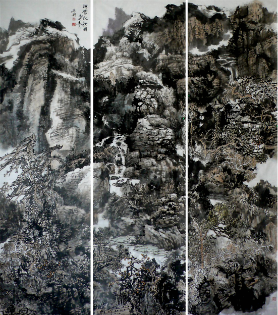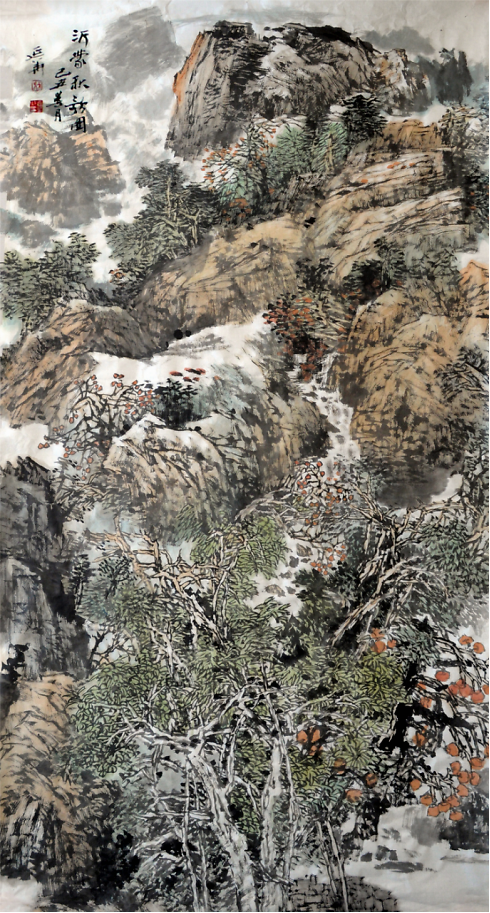 从延华2008年所画《沂蒙秋色》《秋山烟云》《沂蒙金风》等作品中可以看出,他的绘画,一笔一墨乃至通篇的造型意态,都是他真元之气的表现。他把笔用墨,能够抱一守中,举意宅心于山川、溪瀑、树木,故其绘画能够得其“天地大德”。他的这些得其“天地大德”的作品,笔法顿挫有致、干净利落,无拖泥带水之弊,而且气息醇厚,刚中有筋血,柔中有风神,有很强的韵律感;故而,通篇有着和谐、含蓄、活脱及其纵兔奔放、浩荡奋起的美感。可以说,的绘画是文化自信的产物,从他的作品中我们可以看到,他作画取象不惑,笔法洒脱而恣肆放达,气象跌宕奔腾但不失倜傥风流之态。