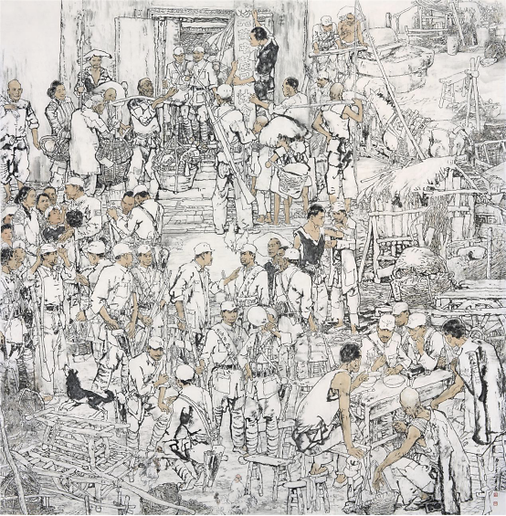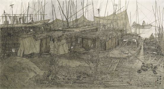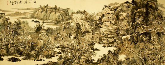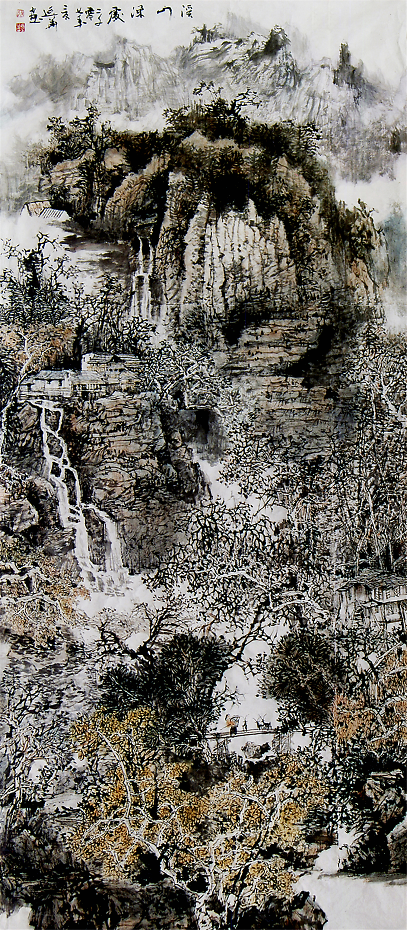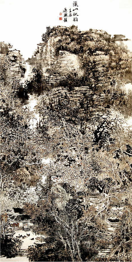 总体上看,张延华的画有声有色,从不拖泥带水。从他的画作中,你可以感觉到那一山一水、一景一物都是其“心灵之诗”借助笔墨倾诉的表现。重要的是,倘若我们从他的作品中切割出任何一个局部进行放大,都是非常好看且相对完整的画面。他的《溪山秋韵》,便是具有“心灵之诗”的好作品。从任一局部中,均可看到笔墨语言本身,这是对历史文化精神的呼唤,它能带领我们走进唐诗、宋词所有表现的那种诗化心灵的空间。于是,看延华的画,就好像我们在看一件有意味的案头古董,既看到了历史、又看到了文心,还看到了相关人物的思想情感和生活方式。在这个意义上,延华绘画中的笔墨造型,便因承载着这样的历史、文心乃至人的思想情感,使我们感到他绘画的形式语言定然是披沙沥金、挖掘国故、重整文心,且以现代人的感受再造山的“心灵之诗”的变现。