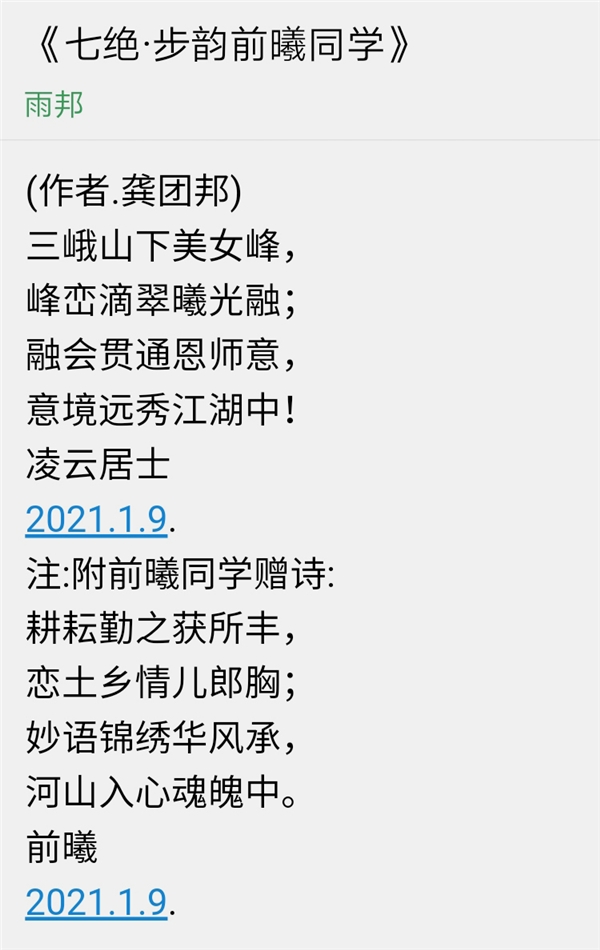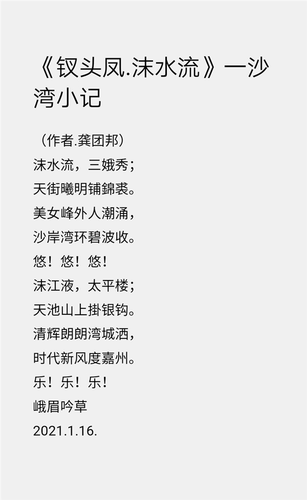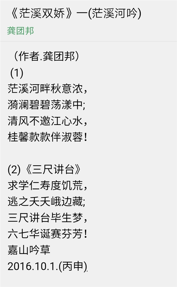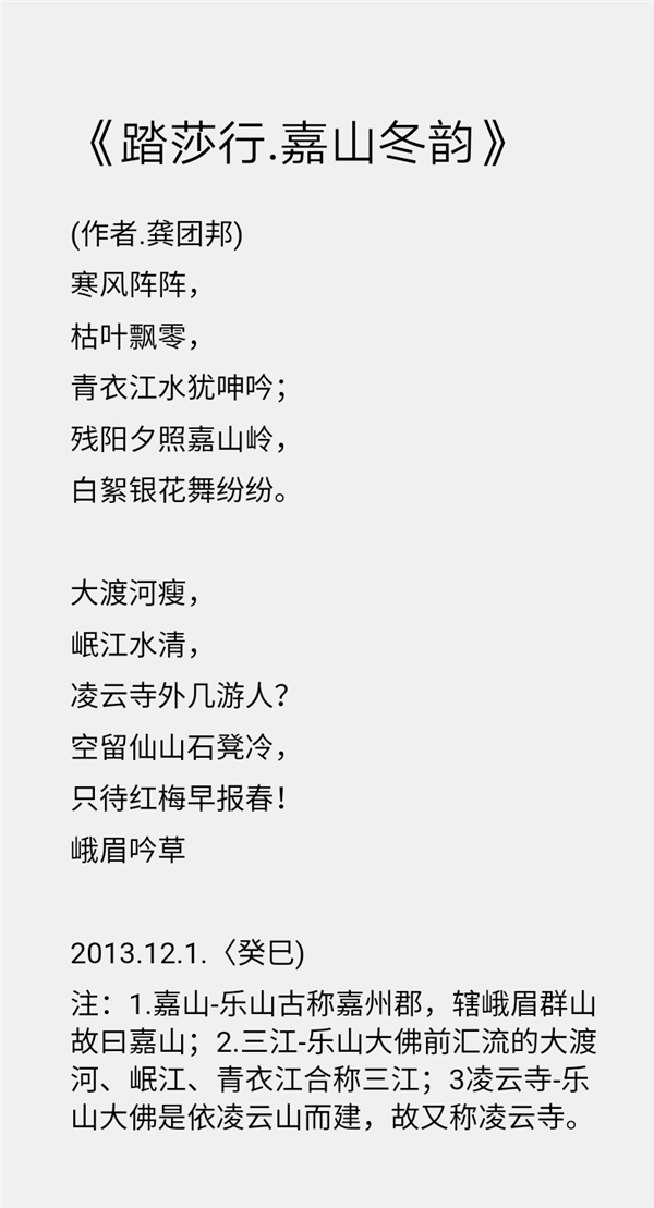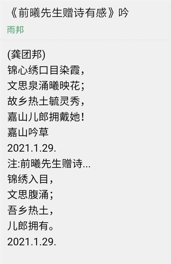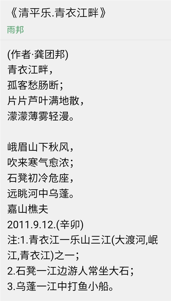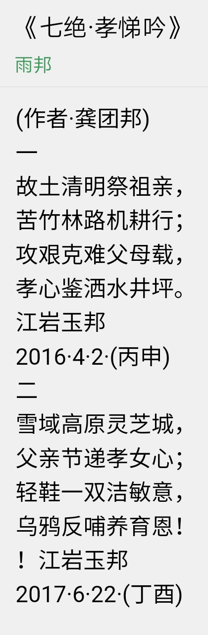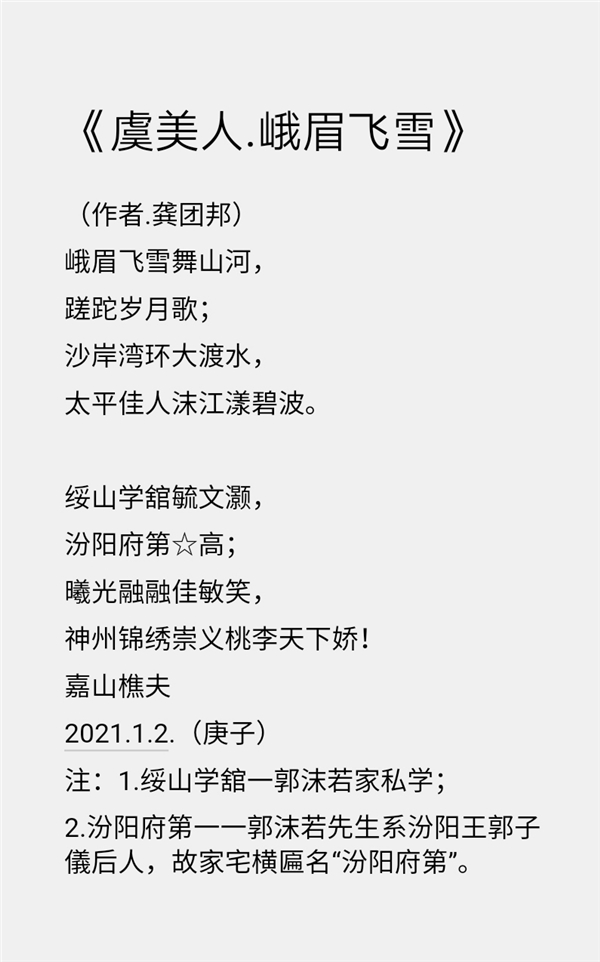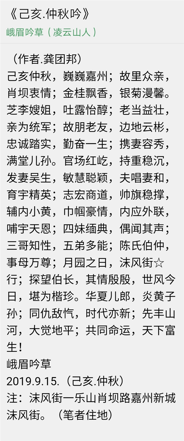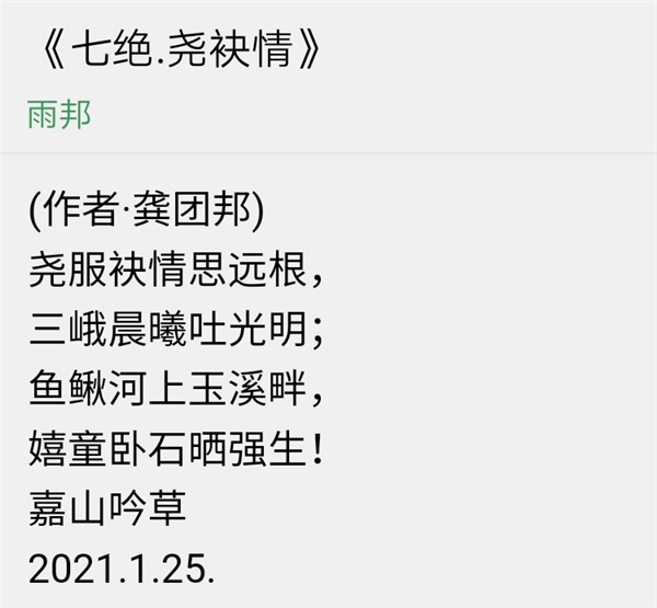 龚团邦,男,字楊铭,号《嘉玉阁》主人;中共党员,中国楹联学会书研会《联墨艺术报》理事(证书编号:2020005280053)。中国楹联学会书法艺术研究会《中华国粹》诗词研究专刊第一届理事会会员(证书编号:20201126007)。笔名汉邦,楊铭,怪老头,乐山乐水,峨眉吟草,嘉山樵夫,凌云山人。 一九五二年出生于四川省乐山县沙湾区老鸦乡;启蒙于郭老(郭沫若先生)故里一沙湾小学,受沫若文化熏陶,酷爱文学艺术及古典诗词的学习与创作。现为中国东坡诗社社员(证书编号:00799),中国国际(香港)艺术家协会会员(证书编号:2013081038),中国人民艺术家协会会员(证书编号:20140101030)。作品分别发表在人民网,新华网,中国书画网,中华丹青网,雅昌艺术网,人民艺术家网,《深圳法制报》,《中国企业报道》《凌云吟》《中国风》《致敬精典》,《采风中国》,《致敬新时代》,《人民的艺术》,《大国崛起》,《大道之行》,《引领时代的中国学者》,《大国崛起.人才强国》,《创新中国的时代先锋》,《赤子情一中国行业精英荟萃》等报刊杂志及网络媒体。并被《中国新闻杂志社》,《曲阜鸿儒书画院》骋为艺术顾问,被《中国工业协会国策智库专家委员会》特骋为书画艺术专家委员,《北京当代环球书画院》骋为副院长;并与《中企华育(北京)国际企业管理有限公司》签订为“战略合作伙伴”。 2020年作品入编《创新智库与时代发展》(中国文艺出版社)大型文献资料汇编。 2020年作品入编中国楹联学会《联墨艺术宝鉴》(中国诗词楹联出版社)。2020年古体诗词作品《虞美人.嘉山秋色》,《踏莎行.嘉山冬韵》,《沁园春.嘉山情韵》被中国文联、中国作协、中国美协联合编篡的大型资料汇编《中国艺术榜样年鉴》所收录(目前中国唯一一部综合体现国家文化力的大型文献一编者。