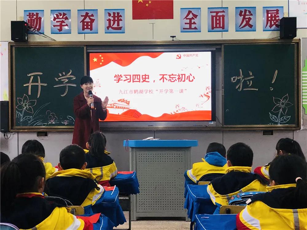 鹤湖学校将爱国爱党元素融入“开学第一课”。在以“红色基因代代传,童心向党迎华诞”为主题的开学典礼上,学校用微课直播学党史。在“开学第一课”上,老师们围绕脱贫攻坚、“四史”教育和“建党百年”主题开展红色教育,引导广大学生坚定不移听党话、跟党走,为建设社会主义现代化强国而不懈奋斗。学生们认真听讲,更深入地了解自己的家乡,学习红色历史,传承红色基因。学生们纷纷表示:“正是因为有那些革命先烈的浴血奋战,才有我们如今的美好生活。我们要牢记使命,不忘初心,在未来报效祖国。” 兴中学校以“沐浴党恩·快乐成长”为主题,举行了新学期线上开学典礼。《赞歌献给党》、《七律长征》、《人民对您最亲》……一首首红色歌曲,表达了大家对祖国的热爱。九江市书画家协会主席、九江职工传承红色基因促进会会长梅楚安讲红色故事——《红船精神永放光芒》,带领孩子们重温革命历史,追忆红色精神。学生们纷纷表示,在中国共产党100周年之际,好好学习、勤锻炼;努力争做党的好孩子,为祖国的发展贡献自己的力量。开学第一天,学校还开展了“心里有话对党说”活动,同学们纷纷通过绘画、文字、制作贺卡等方式表达对党对祖国无限美好的愿景和祝福。
