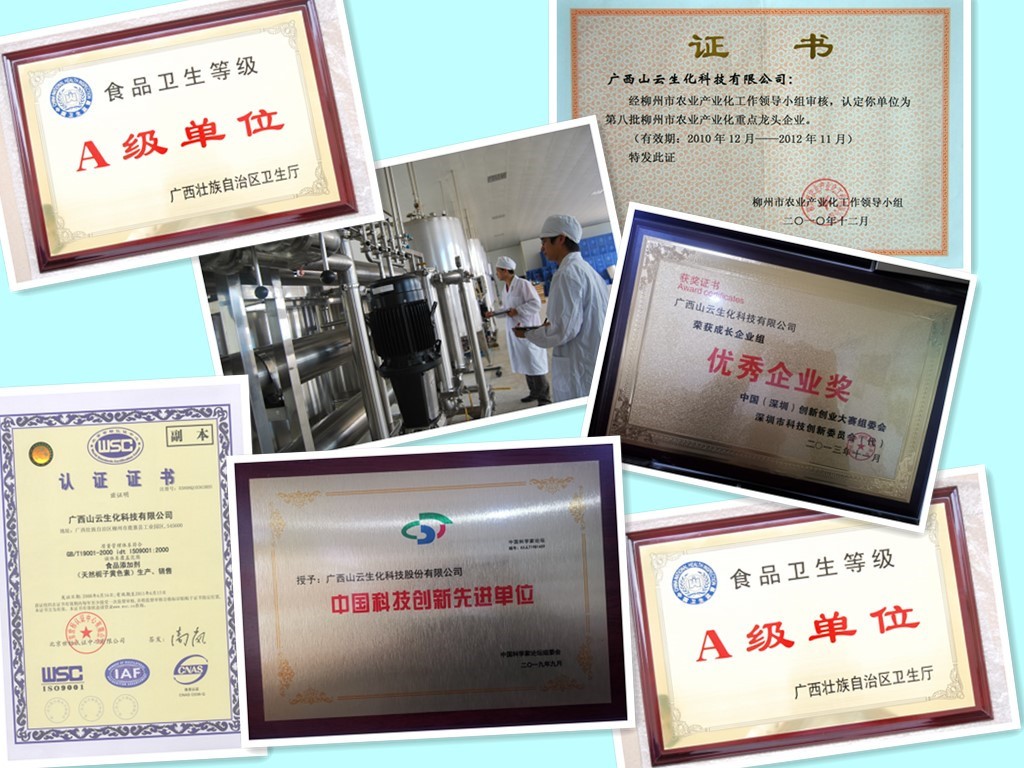 科技兴企——获批多项技术专利,承担国家、省、市众多项目 广西山云生化科技股份有限公司,是柳州市农业产业化重点龙头企业、柳州市科技创新服务示范企业,市辖六县中第一家获得食品卫生A级资质的单位。拥有国家发明专利九项,实用新型专利十二项。利用生物工程技术构建水栀子深加工产业链,生产天然色素、医药原料及副产品,主要产品有:天然色素栀子黄,高纯度栀子苷、京尼平、栀子油等。研发的水栀子综合利用及产业化技术得到了国家各部门认可,承担多项国家级、省级、市级科技项目。2006年9月,公司“水栀子的综合利用及产业化技术开发项目”被国家科技部列为“国家级星火计划项目”;“膜分离纯化技术提取高纯度栀子黄色素新工艺”,“动态萃取技术从栀子黄废液中提取高纯度栀子苷新工艺”,分别在2008年、2012年分别获科技部“科技型中小企业技术创新基金”支持’;“高纯度医药原料京尼平新产品开发”获鹿寨县科技计划项目支持。