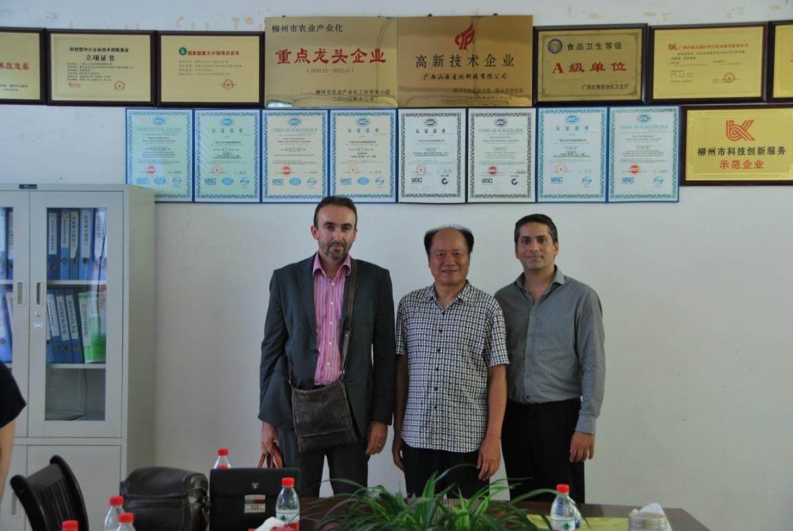 外商参观公司生产车间 精准攻坚——破解高纯度栀子苷、京尼平技术难关,实现产业化。花香引蝶来,外商来司寻求技术合作 同时,广西山云生化科技股份有限公司不断挖掘栀子潜在的价值,在水栀子果实的开发利用研究中发现:水栀子不但能提取出纯天然栀子黄色素外,其生产过程中产生的废液,可分离提取医药原料栀子苷(京尼平苷)、京尼平、栀子油与复方栀子油胶囊。在众多的提取物中最有价值的应属于生物医学原料——京尼平。 据悉,2013年6月28日朱潜荣董事长向李总理写了一封,“针对水栀子提取物京尼平作为生物医药材料战略性产业来发展的建议”,得到了国家信访局的回复。而且中医药管理局打电话向企业索取相关技术材料,并邀请企业上京在国家中医药管理局做相关技术汇报,在现场技术受到了强烈反响。之后中国中医药科学院,主动联系企业采购京尼平产品,进行深入研究。 目前,水栀子提取物京尼平己出口美国、公司、法国、巴西、德国、日本等国。这是广西山云生化科技股份有限公司继栀子黄色素之后,又一重大突破性技术打入国际市场。 国际市场上水栀子提取物京尼平,售价每公斤人民币9万元左右。仅此一项,从不到三万元的栀子原材料,增值收益达198万元,增长66倍。而且,通过种植中药材水栀子提取京尼平(98%以上)的系列产品,已形成生产、加工、销售相结合的产业化经营机制,改变了鹿寨县所产的黄栀子果实一直作为原料外销的历史。这对于打造地方特色经济,发展农产品加工业,调整农业产业结构,推动农业产业化进程,增加农民收入意义重大。加速了农民脱贫致富的步伐,为解决“三农”问题和全面建设小康社会提供了一条有效的途径。