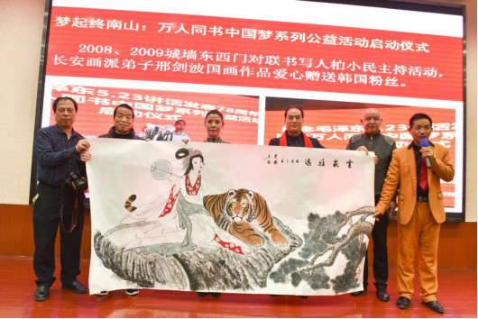 2021汉城湖大集文化街区,徐振清一家人为三千人同书中国梦活动海选和义拍 人与自然和谐相处的美女与老虎,在她的画中威虎带有几分温顺成了福的象征,作品笑对人生大度容天下给人有容乃大的启迪,作品追求营造天地人和谐的大爱大美意境。
