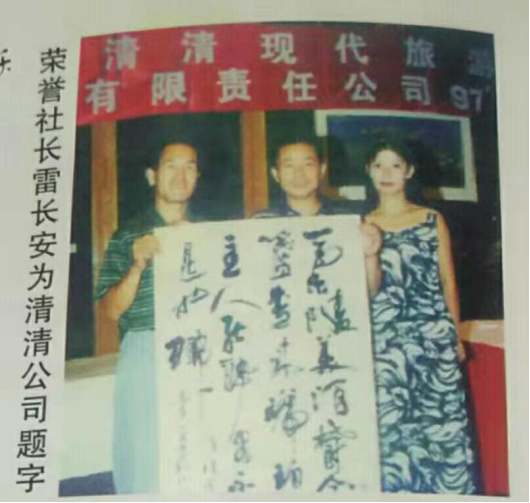 荣誉社长雷长安为清清公司题字 1993年任中法合资大荔矿泉水有限公司销售经理,曾被称为“销售大王”与“公关奇才”的他以“天生我材必有用”的自信和“千金散尽还复来”的豪气组建销售队伍成功开拓销售市场。
