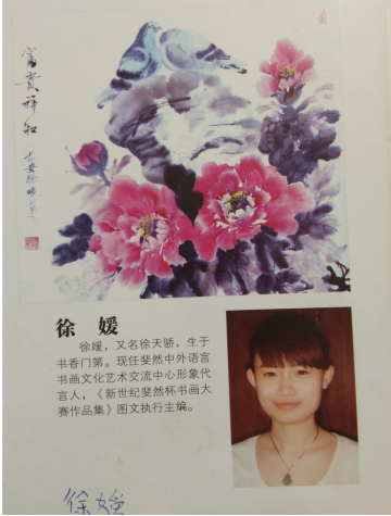 徐媛又名徐天骄,从小受传统文化熏陶爱好文艺能歌善舞,喜欢琴棋书画,天资聪颖,为人率真直爽,追求潮流却又崇尚古朴。虽当青春嘉年华,却能以宁静如水的心态从仁、义、礼、智、信等中华传统国粹文化当中吸取学养,凭着对艺术的酷爱和持之以恒的执着追求,多年勤学苦练,其国画作品和自编自演的文艺节目在学校、工作单位和社会上多次受到好评并获奖。现任中实协、中华忠孝传播协会形象代言人、《中华国粹年鉴》副主编、中实协巡拍电子图文主编,将中国文化传统传承与网络创新的运作模式紧密结合,不断进行线上线下传播交流全方位服务进一步满足中国传统文化在全球范围内的巨大需求,努力为实现中华民族复兴和中华文化走向世界的中国梦做出自己的贡献。