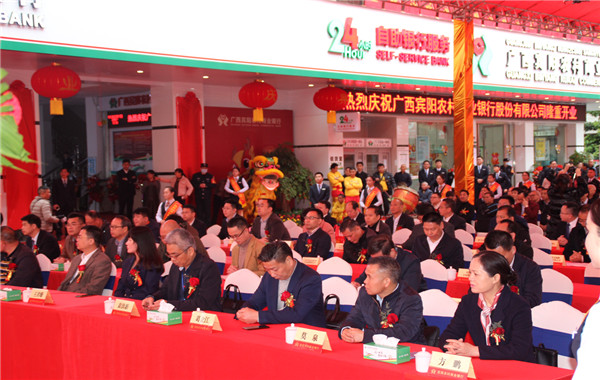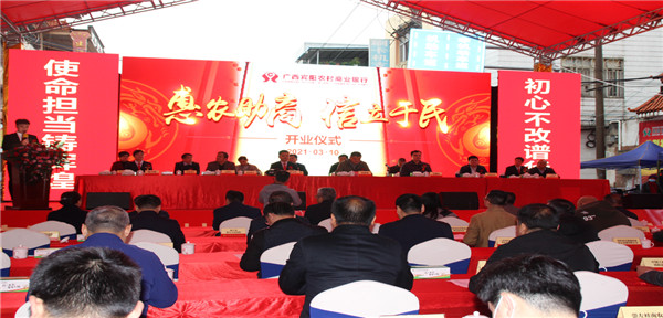 广西宾阳农村商业银行开业庆典仪式现场 张春梅/摄 开业庆典仪式上,广西银保监局宾阳监管组负责人宣读了开业批复,并向广西宾阳农村商业银行股份有限公司董事长颁发金融许可证。自治区农村信用社以及宾阳县人民政府相关领导在会上分别致辞。大家一致认为,宾阳农商行的组建,是宾阳县金融业发展史上具有里程碑意义的一件大事,对于进一步完善农村金融体系、增强金融发展活力,更好地发挥金融的支撑和服务作用,必将产生重大而深远影响。