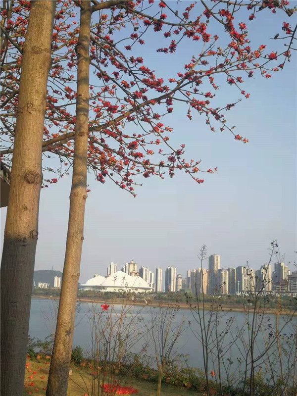 邕城春景 一江春水绿,两岸木棉红。 习习东风过,纷纷落草丛。