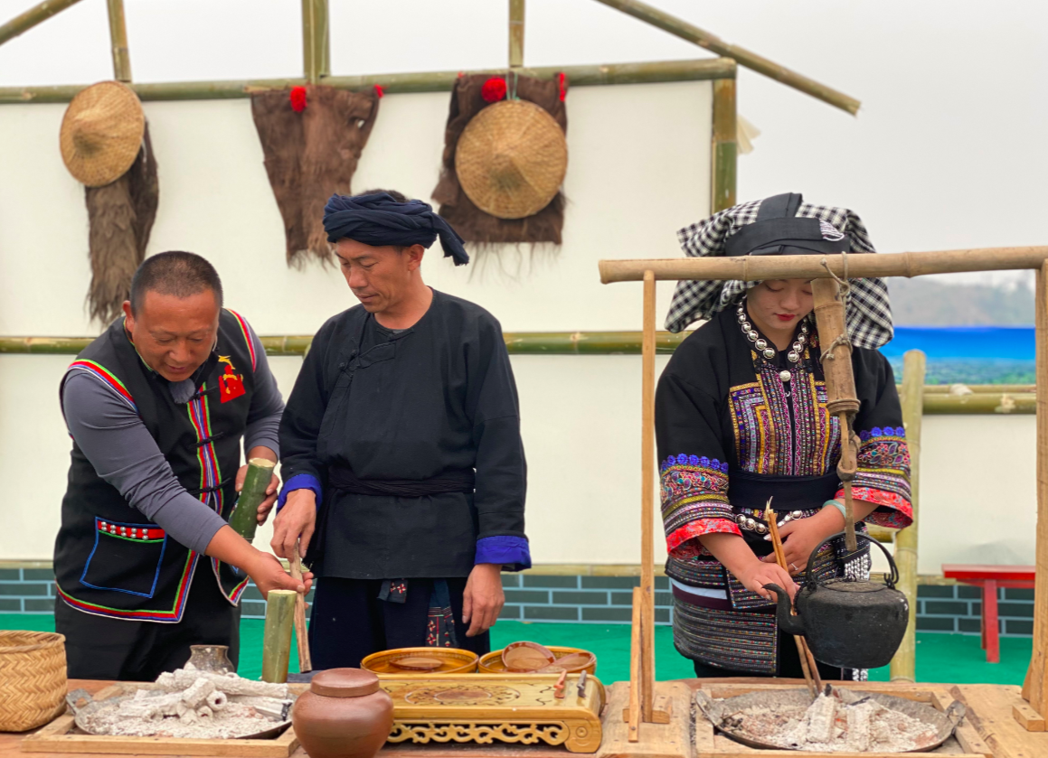 永德县文化和旅游局副局长、县文联主席李有旺,表演俐侎竹筒雷响茶