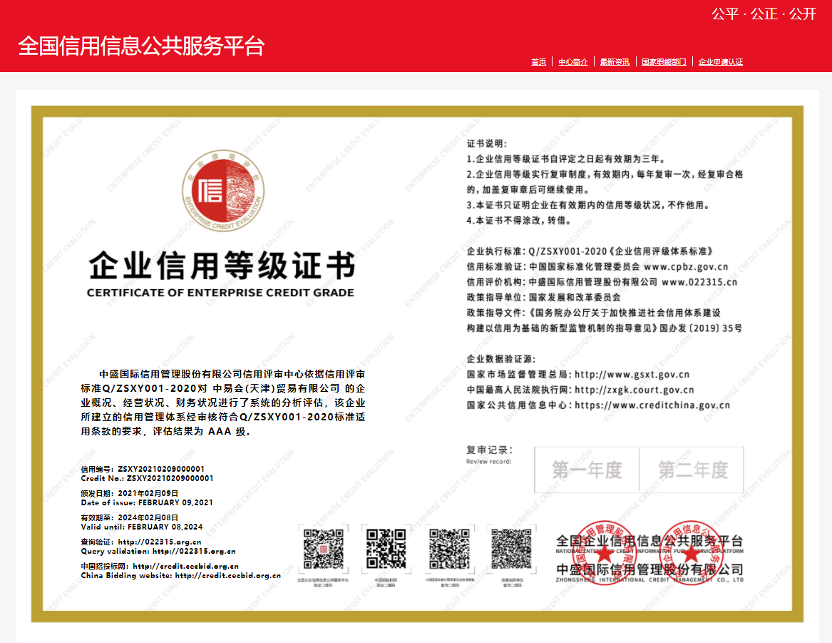 2021年02月09日,由专业的第三方信用服务机构:全国企业信用信息公共服务平台、中盛国际信用管理股份有限公司通过国际通行的“四等十级制”评价等级对中易会(天津)贸易有限公司进行多维度考核,评价要素主要包括基本条件、企业状况、经营管理能力、财务状况、信用记录等方面进行综合信用评价,通过信用评价办公室初审、专家评审委员会审定,经严格评选之后最终确定。