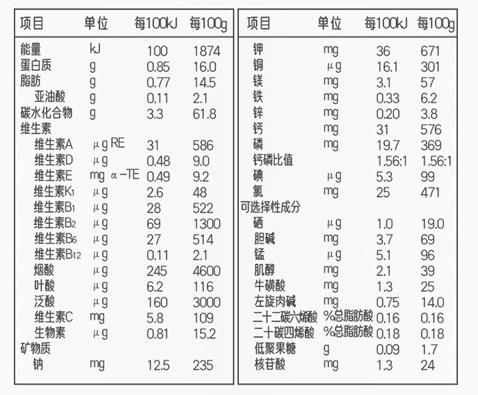 配方 其实通过配方注册的合格奶粉基础营养成分(必需成分)并没有太大差别,因为国标对于奶粉的基础配方有明确的规定,想要通过配方注册的奶粉其基础配方指标都要在国标规定的区间之内。这大概也是为什么会有“市面上的奶粉差不多,高价奶粉是智商税”等说法的原因。但除了基础配方(必需成分)奶粉还有可选择性成分与添加成分,这也是各品牌奶粉的最大区别点。以下附较大婴儿配方的国标,喜欢深扒的爸爸妈妈可以仔细看一下。