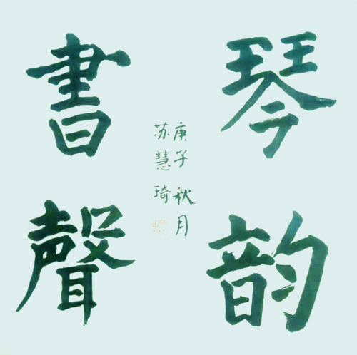 《琴韵书声》 2021年,慧琦小同学积极响应党的号召,在学校及母亲的辅导下,学习党史,牢记使命,不忘初心。在中国文化报道穆雪女土的点评下,许海梁先生的指导下,先后创作了“为中华之崛起而读书”、“千里之行始于足下”、“少年心向党、建功新时代”、“祖国江山千里秀、华夏民族万年青”、“众志成城、全民抗疫”、“学习党史、不忘初心、牢记使命、服务人民”、“爱国敬业、诚信友善”、“中华腾飞”、“学贵有恒”等富有爱党、爱国、人民至上、庆祝建党一百年为内容,鼓励少年儿童积极向上,具有时代气息的优秀作品。