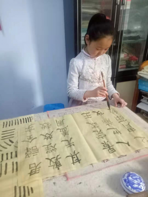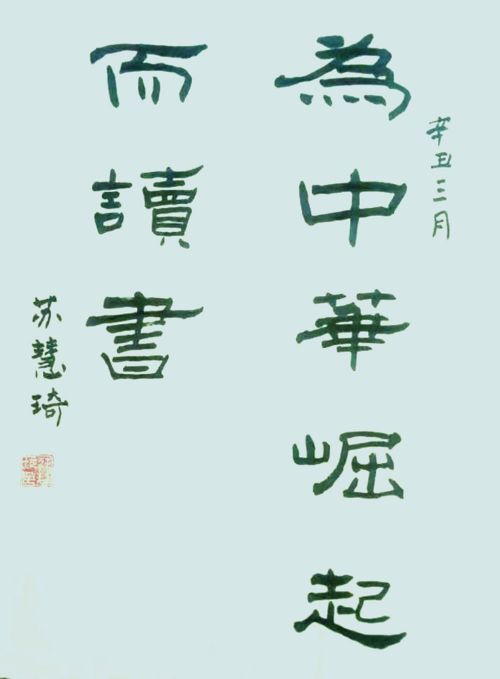 《为中华崛起而读书》 在社区,大家都称赞小慧琦是个懂事的好孩子,尊敬长辈、诚实守信、遵守公德得到邻里好评。 在完成学业课程基础上,挤出时间学习书法,学习过程中从不叫苦叫累,在母亲的指导下,先后学习了《多宝塔》、《勤礼碑》、《曹全碑》、《兰亭序》。从字法、线法、笔法、墨法、章法“五法”入手。楷书学习遵循“平、直、均、密、锋、力、轻、决、补、损、功、称”12字原则。隶书学习掌握结构、结体、用笔等方法。行书学习掌握自然优雅、秀美飘逸,每一笔从入纸、牵丝、提、按、转、折反复练习,掌握其要领。