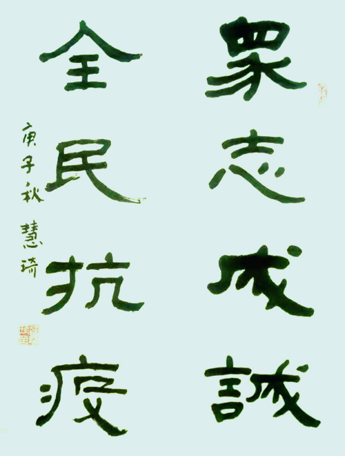 《众志成诚 全民抗疫》 苏慧琦同学生在新时代,党的各项惠民政策阳光照耀下茁壮成长,亲眼所见祖国发展的繁荣昌盛,这些发展政策、实事、改革成果感动教育着下一代。使幼小的慧琦同学深感幸福,倍受鼓舞。慧琦小同学决心听党话、感党恩、跟党走、学好党的历史,不忘初心、牢记使命;立志好好学习,同时努力学好书法,争做新时代优秀少年;长大后,做祖国有用人才,为建设中国特色社会主义贡献力量。