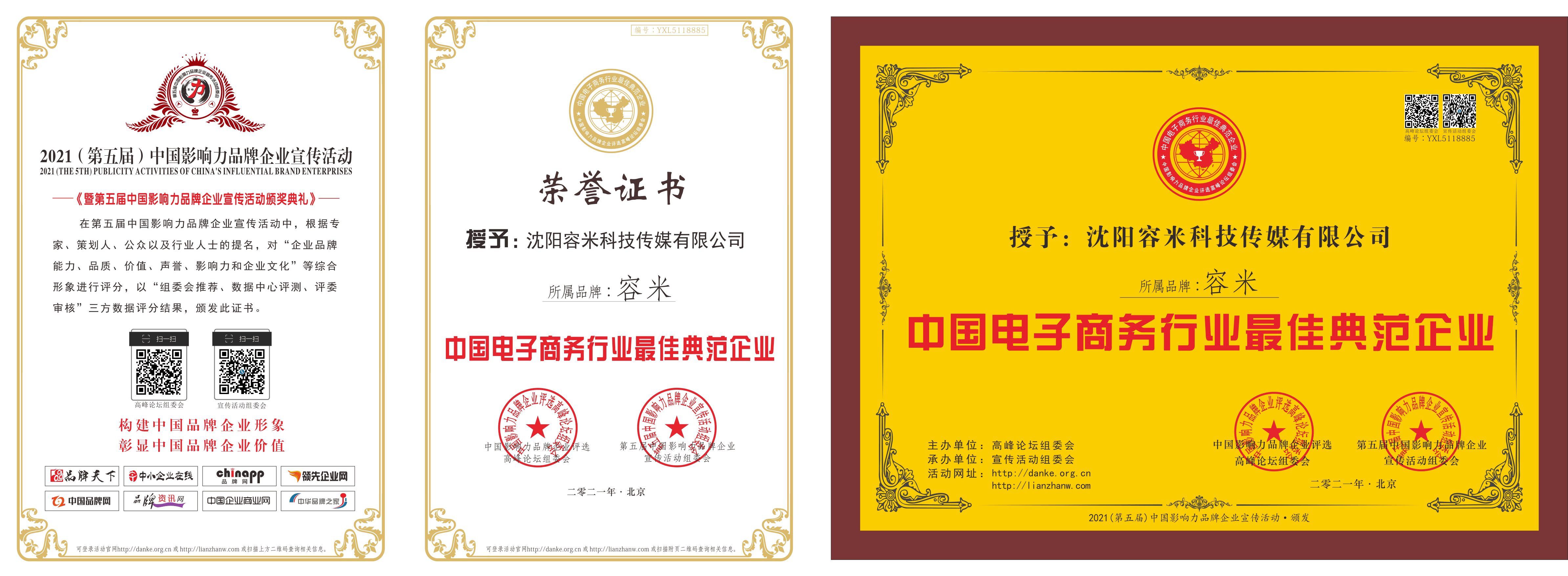 2021年沈阳容米科技传媒有限公司在第五届中国影响力品牌企业宣传活动中,根据专家、策划人、公众以及行业人士的提名,对“企业品牌能力、品质、价值、声誉、影响力和企业文化”等综合形象进行评分,以“组委会推荐、数据中心评测、评委审核”三方数据评分结果,被授予中国电子商务行业最佳典范企业荣誉称号,并颁发证书。