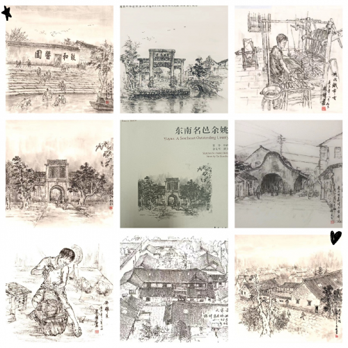 图:张钟的书和作品 要说我的感受,不得不说,那真是太多了。第一次拿到张钟的钢笔画册应该是十年前了。而我在过去逛书店时,基本零钱都是买画画的书。曾购得一本钢笔技法书,也试着按书上临摹,对钢笔画颇有兴趣。 那第一次,看到张钟先生的画册非常喜欢,画中有浓浓的水乡江南味,我连忙追上作者,问他讨要。因我知道有的书是孤本,并没抱太大希望,没想到,没过几天,张钟送来了书。后来我还知道他还是一位成功企业家,能够在绘画和工作学习中找到平衡点,坚持下来并取得一定成就,实在是难得。因他知道我也是绘画爱好者,就不时把他的新作发来,有的还附有文字,让我知道一些作品诞生的故事很不易。 张钟是一位非常勤奋的人,他画画得在业余时间进行,甚至是出差、参观间隙。记得有幅画是和他同去的人去公园里面参观,而他在外面门口看到外墙门就有了绘制的冲动,他就迅速找好角度画了下来。还有不论刮风下雨,太阳晒,只要有机会画,都会去做。有的作品的绘制过程非常感动,有次我知道他在雨中速写,而他的岳父为其打伞。他的作品,似乎得至天成,虽是速写,就像摄影一样,能很快抓住焦点,但他和摄影又不一样,意在笔外,需要对景物进行筛选取舍,甚至为了主题加入一些应景的人物,让画面有了动感,这样画面异常生动,并有了动静对比,因此,其写生的过程也是创作过程。没有一定的功力,在短时间内,像他这样的作品完成是很难的。不得不佩服作者的选景,把本次画册的每一处主题表现得淋漓尽致,画者是有心的。因此有了本书的体例,本书分为历史流韵、古城遗迹、乡村记忆、寺院庵庙、民俗风情几个部分,是学苑出版社“故园画忆”系列的其中一种。 这种作画工具,即钢笔有的是特制的。有的需要很紧密的线条,有的又要非常松的线条,松紧得当才是好作品。再怎么说钢笔画起来,一个面积一个面积去涂,去点,是有点耗时的。钢笔天生就是黑白为主,要在黑白上做文章。留白也是核心要素,留白,可以带来意外的画面想象空间。比如:水乡的描绘,常常让人有黑白强烈的反差。布局平衡是对绘制景物,特别是建筑物的基本要求。作者作品里多是家乡的描绘,建筑街巷是重要题材,有的画面透视感非常强烈,特别是俯视作品,南方的乌色的瓦,一直是我喜爱的。描绘古镇临山的高宅大院,一个俯视,让画面成了画卷。焦点消失在画外,那些大宅子里不知有多少像“雷雨”的小说故事发生?张钟画中充满着强烈的爱,那是对故土的爱。作品里,作者敏锐地表现了家乡发生的可喜变化。参考老照片后,让一些不复存在的景物复活,更让人充满了怀旧感,如对老余姚中学的校舍写生作品就是这类代表。 张钟的写生作品保留了家乡记忆,最突出的是对文献名邦门楼描写,成为了本书的封面画,也是历史遗迹的永恒。不能不说,他的作品也是余姚地方、乡镇的名片,就和我去杭州看西湖一样,有西湖十景的精美钢笔画,张钟的精美作品也一样,有的会成为名片。我惊叹钢笔的表现力,既有宏伟的阔,也有小桥流水的雅,可能“张钟线条”名不虚传也。 在张钟的水墨画作品里,其实有一幅特别让人感动的画,就是描写抗战时期的一位我国飞行员周训典出征的镜头。我才知道咱们宁波也有第一代空军队员和日本航空部队对峙。这些为保卫祖国不惜牺牲个人生命的优秀飞行员是时代骄子,是历史英雄。当时我正在看林徽因的弟弟的故事,其弟明明知道会死,还要去战场,牺牲在抗日的最前线。 带着灵魂去创作,让张钟的作品有血有肉。在其创作的诸多人物作品里,题材也非常广泛,比如个人的写真人物的刻画,一些人的劳作,都充满生机。我见过其画过的田间地头,也有建设者带着安全帽典型形象,他处理得都详略得当。有人说画家是在画自己。是的,他的作品,难免说没有他的影子。从十七岁画到现在,四十多年了,他画出了家乡,也画出了自己。作为东海城市文化研究院的秘书长,作为浙江省美协会员,他的画具有浓重的人文情怀。