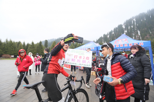 空中俯瞰那拉提山林雪地 第一赛段中,精英组选手需要骑行17公里,在那拉提森林公园处由骑行变为跑步,连续攀登2700级台阶,抵达天鹰台处的终点,“骑行+登高”的组合,让选手充分享受到了不同层次的那拉提之美。大众组方面,组委会设置了更为“休闲”的竞赛方式,以那拉提国家旅游度假区全域为竞赛范围,选手骑着单车定向打卡那拉提网红景点,通过微信朋友圈等方式分享自己的骑行乐趣,营造出了游者乐其(骑)行,竞者行其(骑)事的赛事氛围。
