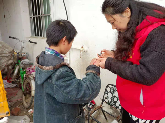 每到一户,他们不仅为孩子们送去图书、本子、文具等学习用品,还有被子、食用油等生活用品,大家有的帮他们打扫卫生,有的为孩子辅导作业。爱心人士韩中梅、周春瑞还为每个孩子送去二百元生活费,义工们的无私帮助,让陪同慰问的当地村干部深受感动。