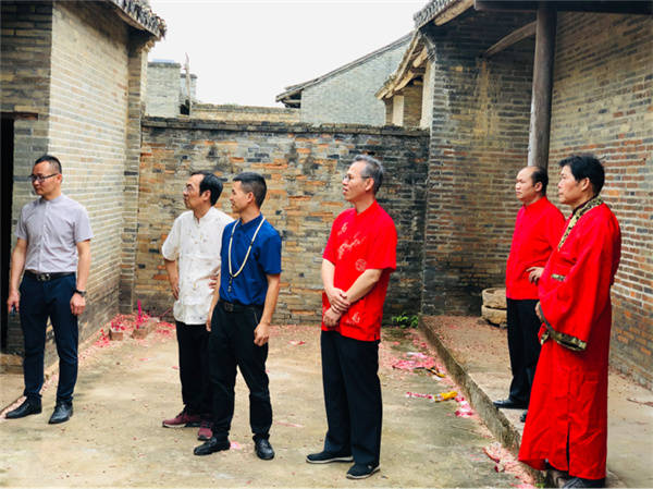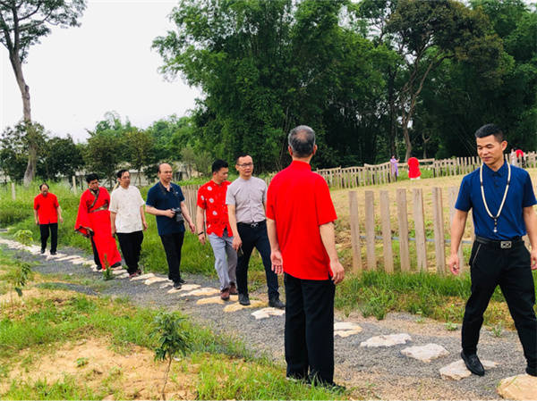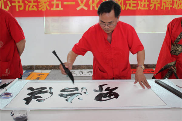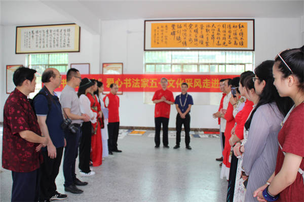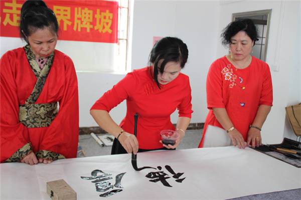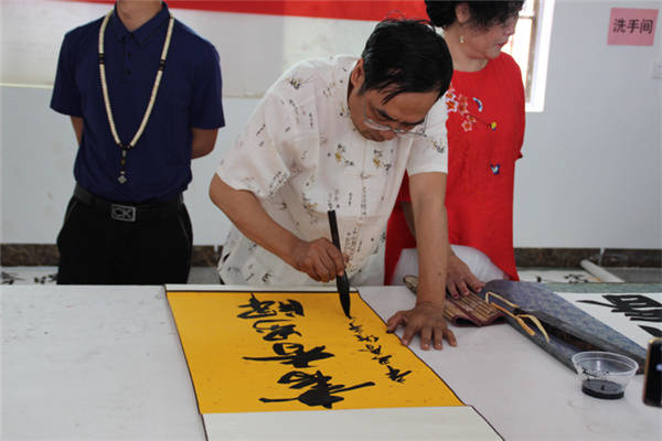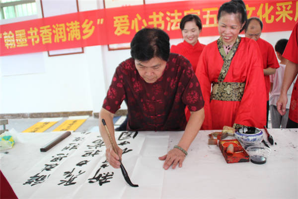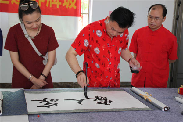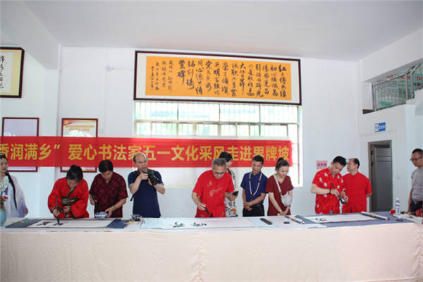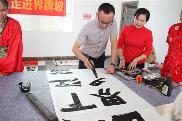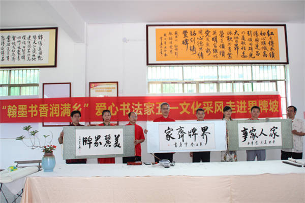 书法家们现场挥毫泼墨 张春梅/摄影 当天上午,在界牌坡乡贤参事会会长覃来庆的带领下,爱心书法家采风团首先兴致勃勃地来到界牌坡古民宅建筑群参观游览。界牌坡古民宅虽然历经百年风雨沧桑,但是座座民宅保护完好。屋脊高翘,雕梁画栋,砖石浮雕,门墙厅壁书画点缀,别有一番情趣,篆隶行楷,各具韵味。好一幅青砖黛瓦存古韵,碧水蓝天恋游人乡村画卷。随后艺术家采风团参观了正在建设中的界牌花园,界牌花园遵循着自然的规律,营造自然与人文,自然与生命,最终回归于生活的建设理念。并重点以齐家文化教育和自然生命教育为灵魂,进一步厚植文化底蕴,促进乡风文明,致力打造“一步一景观”、“一墙一书画”的新农村新格局。
