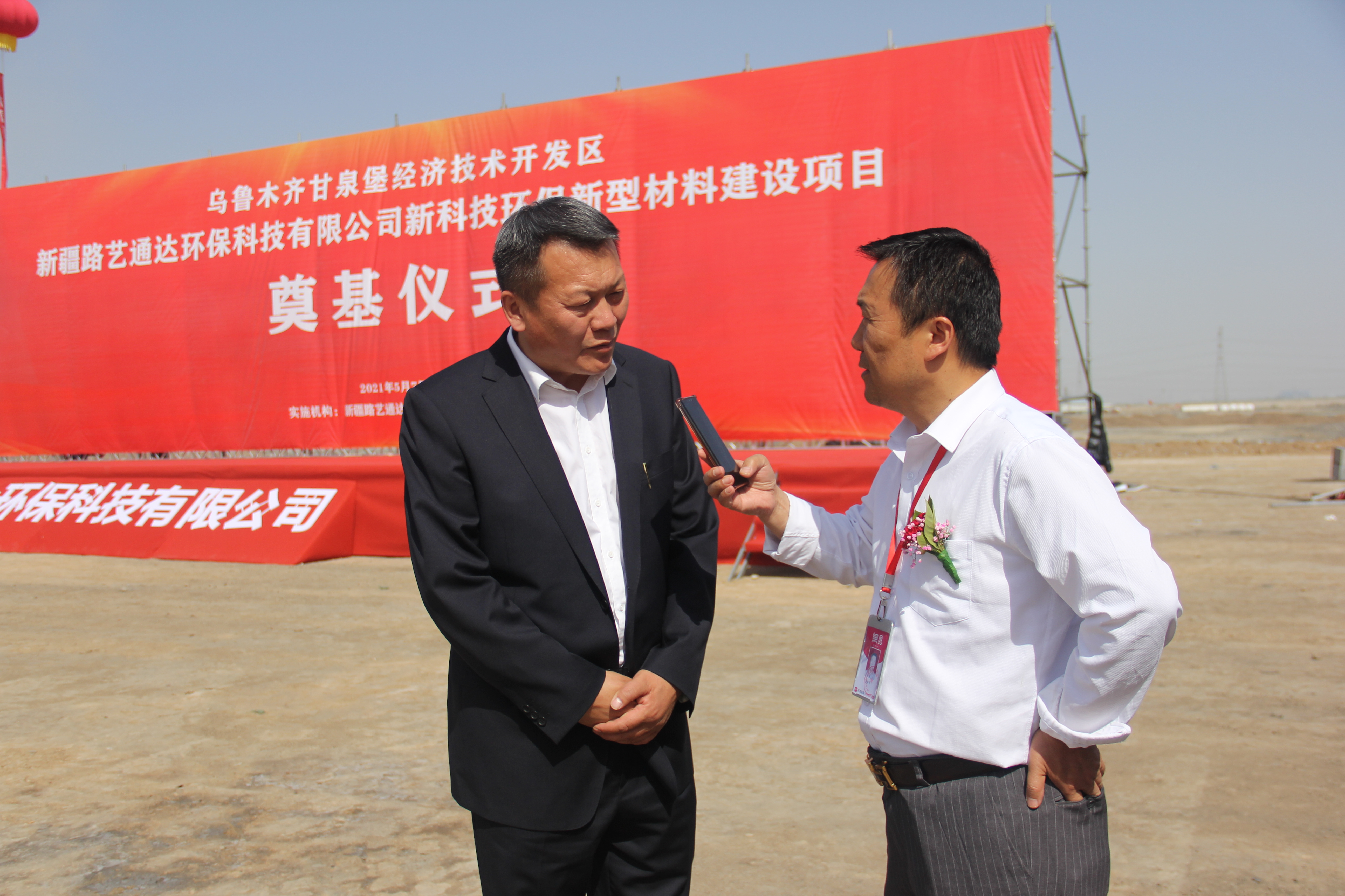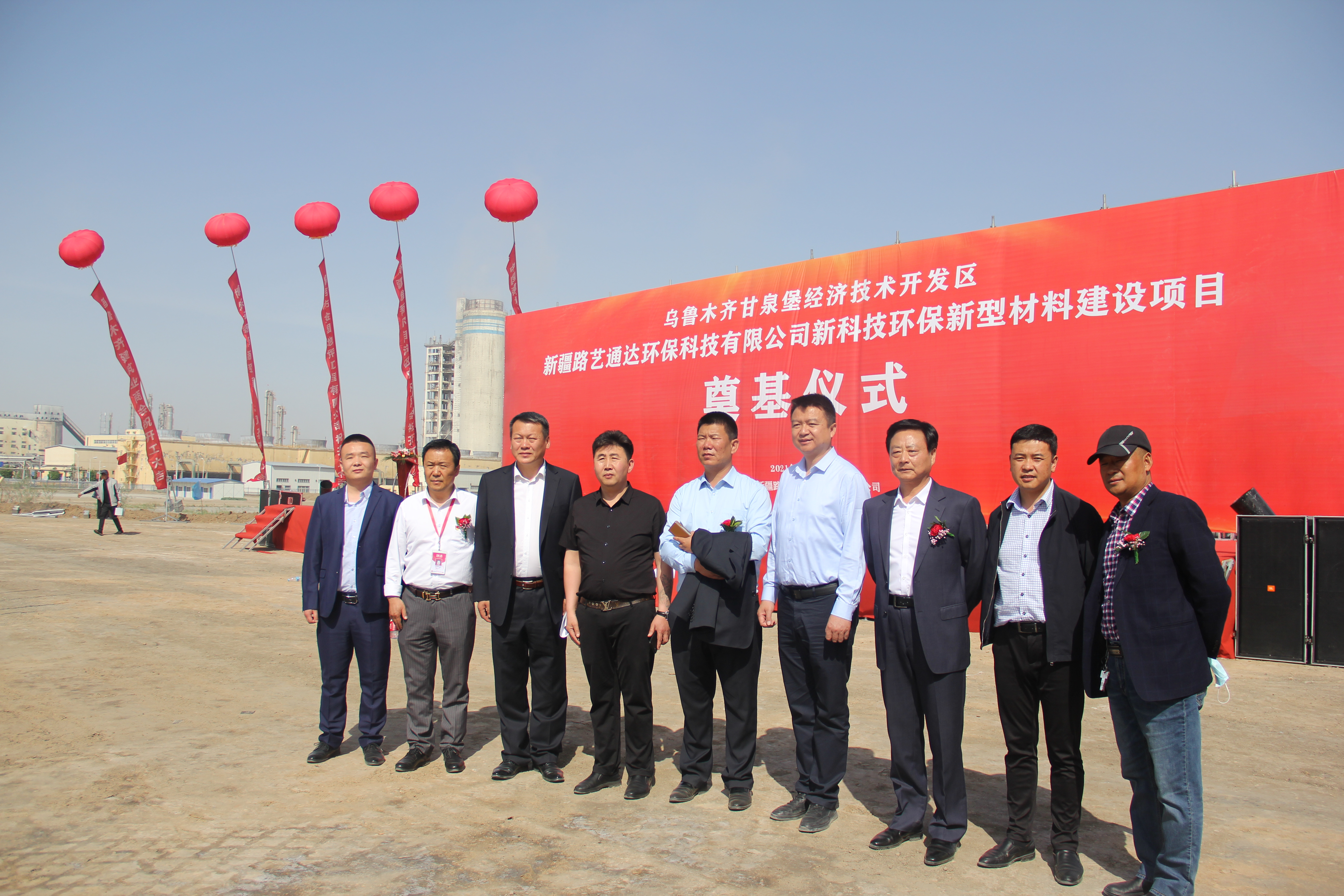 奠基仪式现场 5月7日,由新疆路艺通达环保科技有限公司投资的新科技环保新型材料建设项目落户乌鲁木齐市甘泉堡经济技术开发区并举行奠基仪式。 乌鲁木齐甘泉堡经济技术开发区党工委副书记、管委会主任程新建,乌鲁木齐甘泉堡经济技术开发区党工委委员、管委会副主任孙长伍,新疆维吾尔自治区建筑材料行业商会地坪分会会长刘杨,新疆路艺通达环保科技有限公司董事长梅本武,乌鲁木齐婚庆协会副会长李平,新疆立邦刷新装饰工程有限公司总经理徐仁淮等领导和嘉宾100多人参加奠基仪式。乌鲁木齐著名主持人张华主持奠基仪式。