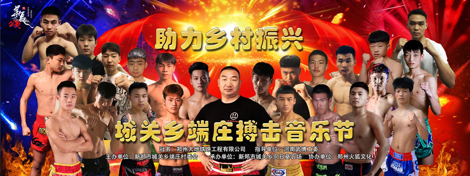 助力乡村振兴,中原勇士,决战中原!本次活动指导单位为河南武博工委;由新郑市城关乡端庄村委会主办;华夏颂搏击联盟、铁峰搏击承办;新郑市城关乡向日葵农场、郑州火狐文化协办;郑州大地铁路工程有限公司冠名。本次赛事用品由五龙体育提供。