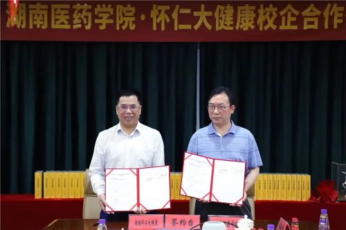 2021年5月11日,怀仁大健康与湖南医药学院产学研校企合作对接会暨合作签约仪式在怀仁总部隆重举行,湖南医药学院校长何清湖、副校长李峰、饶利兵,护理学院党总支书记黄文杰、康复医学与保健学院党总支书记陈继松、药学院院长吴卫华、科学技术处处长黄雪霜、发展规划处副处长李青、继续教育学院党总支副书记尹丽,特邀嘉宾湖南中医药大学副院长谢梦洲、处长田雪飞、陈小平教授、骆敏教授、严喧喧副教授、胡宗仁博士后、刘露梅博士后,怀仁大健康董事长兼总裁林承雄、党委书记兼副董事长陈毳萍、常务副总裁姚亮贤、董事兼博世康总经理蒋忠全、总裁助理兼人才发展中心总监徐坤、董事会秘书林可可等领导出席,湖南医药学院副校长李峰主持签约仪式。