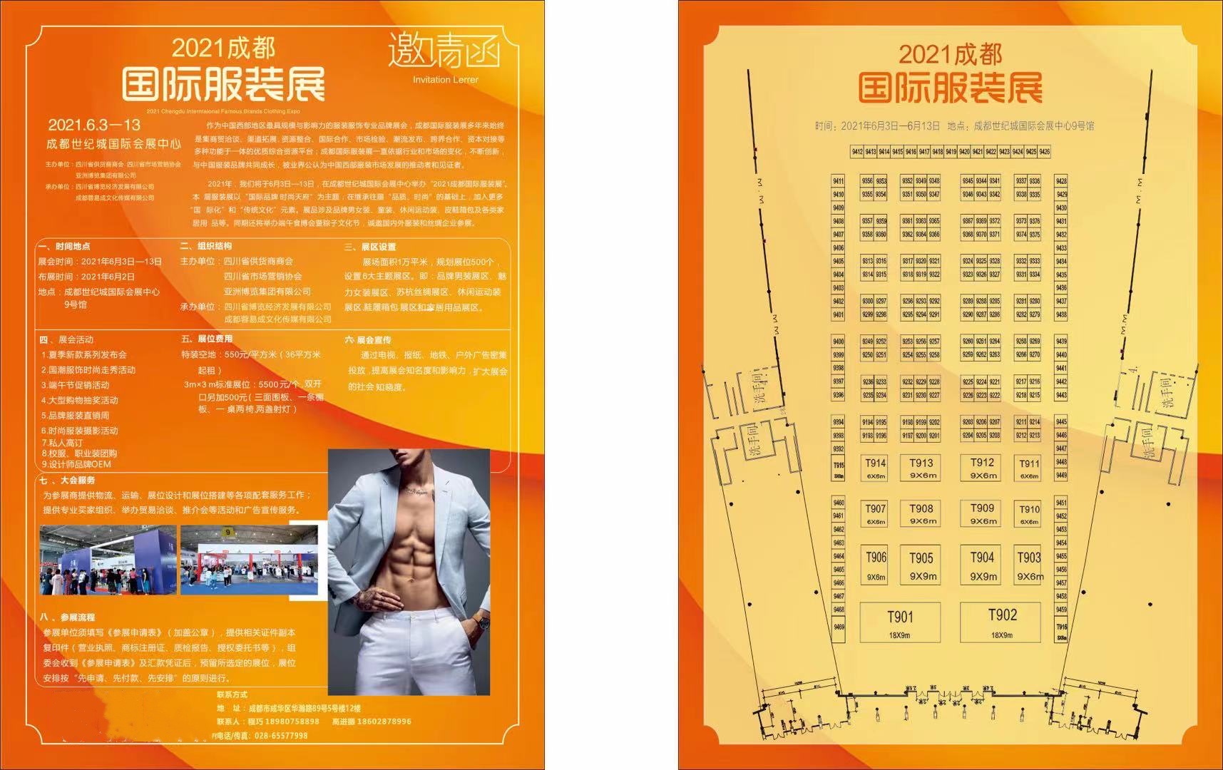 7 展位费用 特装空地:550元/㎡(36㎡起租) 标准展位:5500元/个,双开口加500元 (标配3mX3m,3面围板、1条楣板、1桌2椅、2盏射灯) 8 联系方式 2021成都国际服饰展