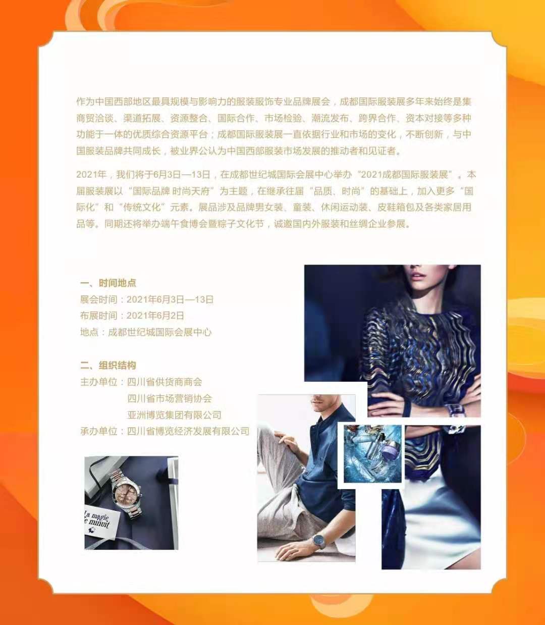 2021年,成都市启动实施幸福美好生活十大工程,人民群众对品质生活、品质消费的需求越发迫切。 为深入贯彻落实国家扩大内需、全面促进消费系列决策部署,顺应当前消费需求,抓住春夏及端午节庆消费旺季,搭建新国潮服装服饰销售平台,线上线下多渠道展现时尚潮牌,着力开展新国潮消费促进活动,扩大时尚潮牌影响,由相关省级部门支持的2021成都国际服装展将于6月3日-13日在成都世纪城国际会展中心举办。 往届展会实况